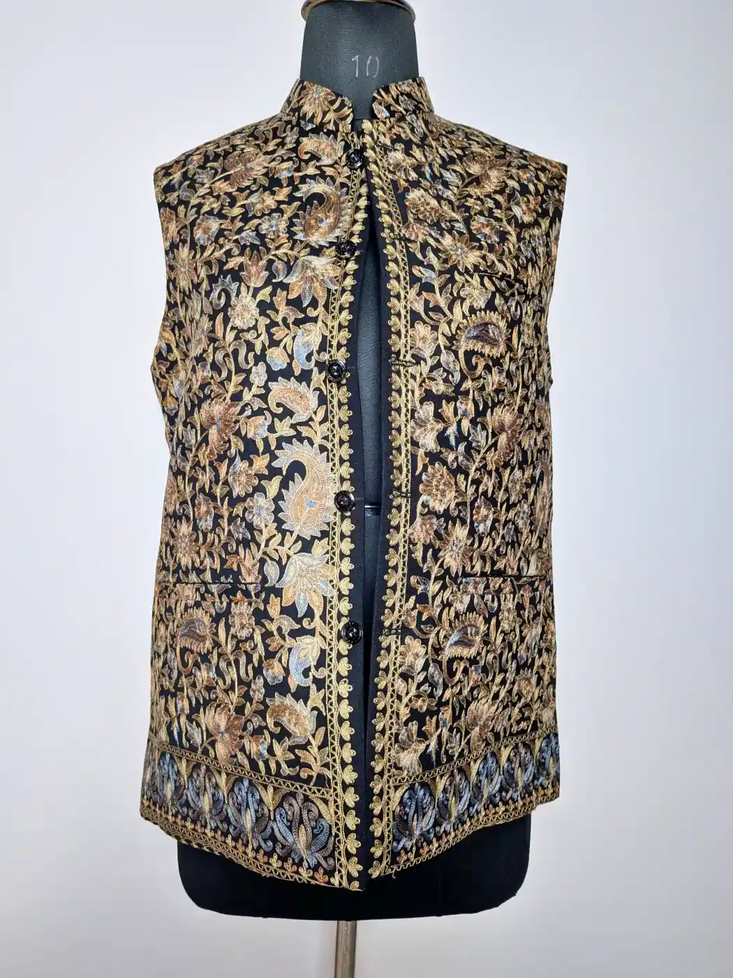 Crafted in Kashmir, this black waistcoat is cut from premium Toosha fabric and detailed with Aari embroidery in Kalamkari motifs. The badam, chinari and floral design in orange and yellow threads, flows with precision, adding depth to its rich texture. An all-seasonal layering essential, it’s ideal for pairing with both festive attire and smart casuals, that makes it a bridge between tradition and today’s fashion.