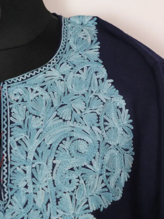 Tweed shapes this blue phiran into a winter essential. Floral with badan pattern aari embroidery defines the neckline with elegance.