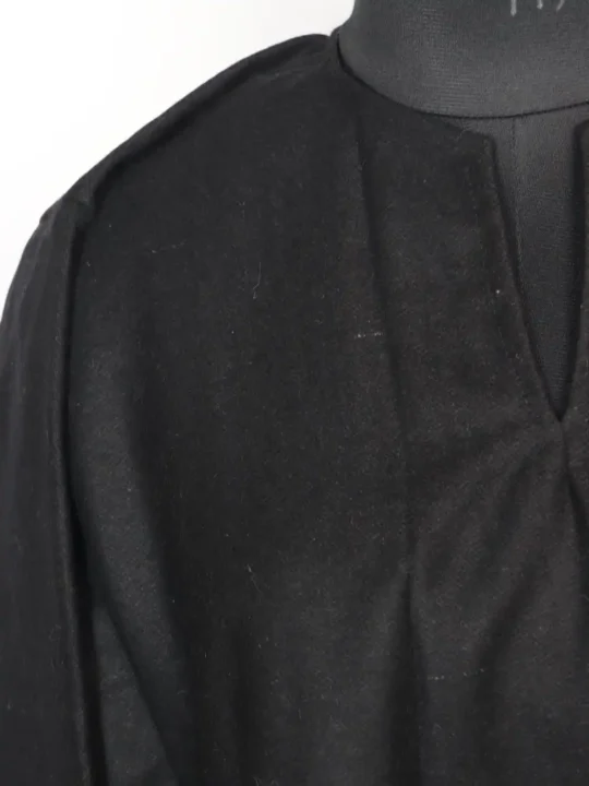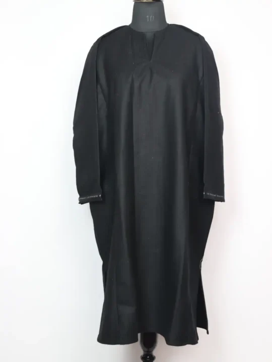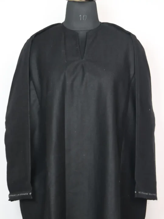 This black color pheran is cut in tweed, shaped to hold winter’s chill away. It’s plain with no embroidery on it. As a tradition in Srinagar, such pherans are valued not only for their function but for the artistry stitched into them, which keeps heritage alive in daily wear.