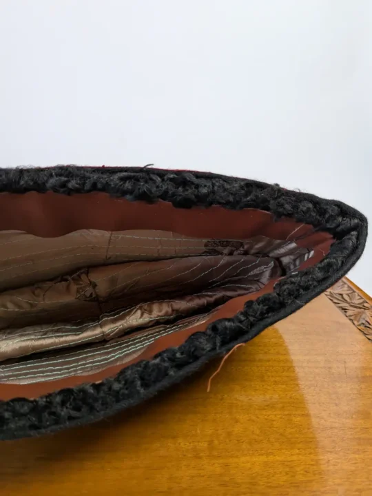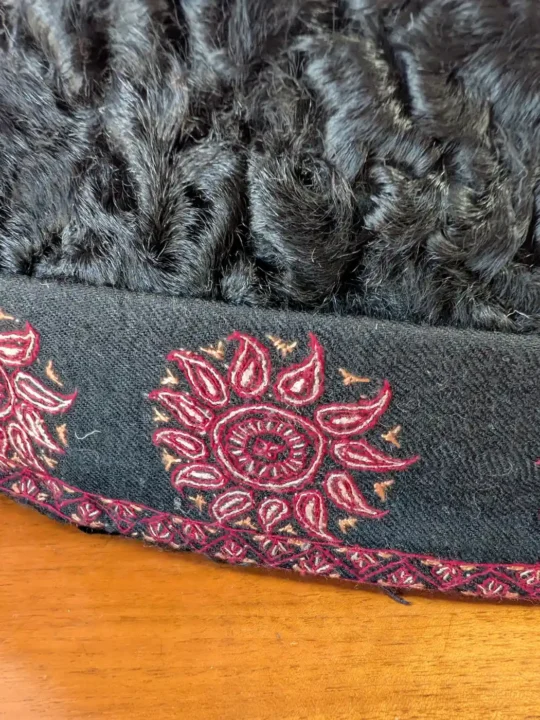 Are you looking for a unique and stylish cap? Check out this Black karakul fur cap with an embroidered brim. It’s hand sozni embroidery from Kashmir.