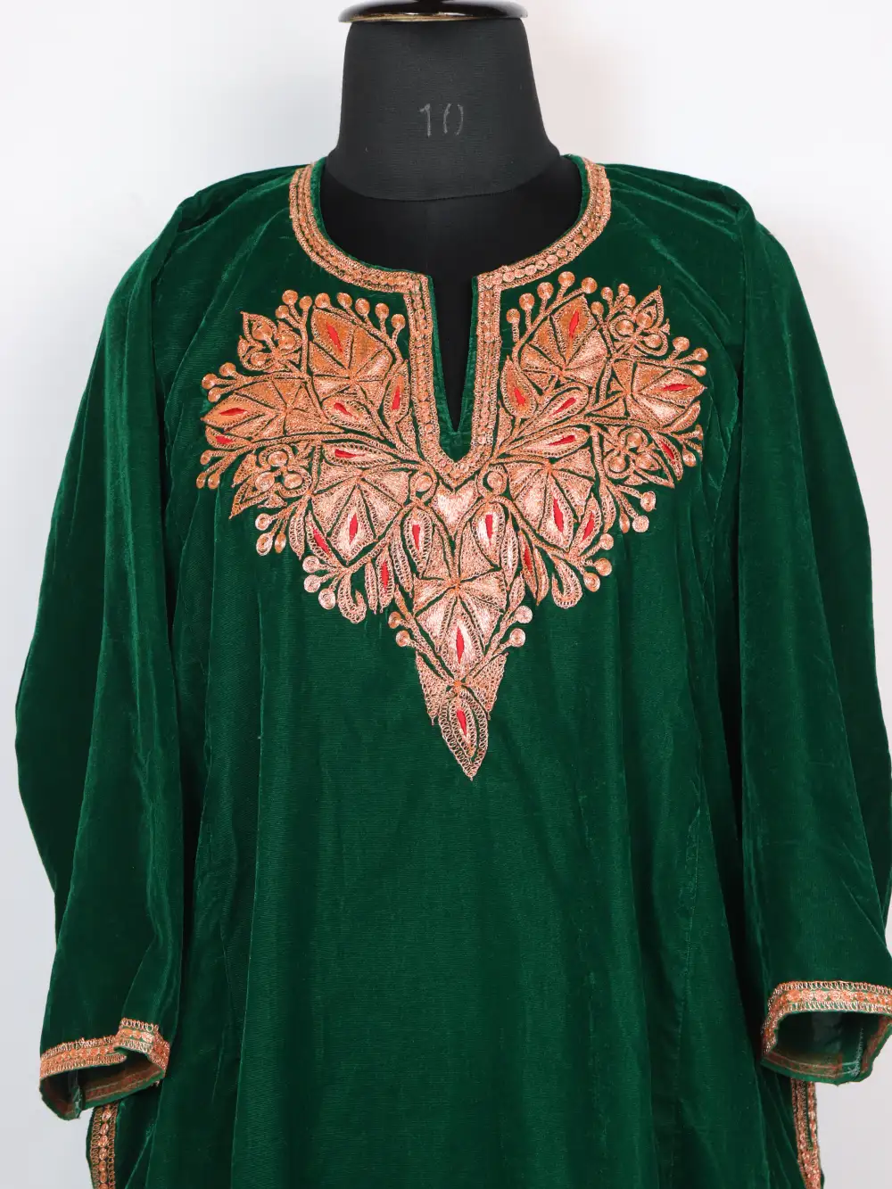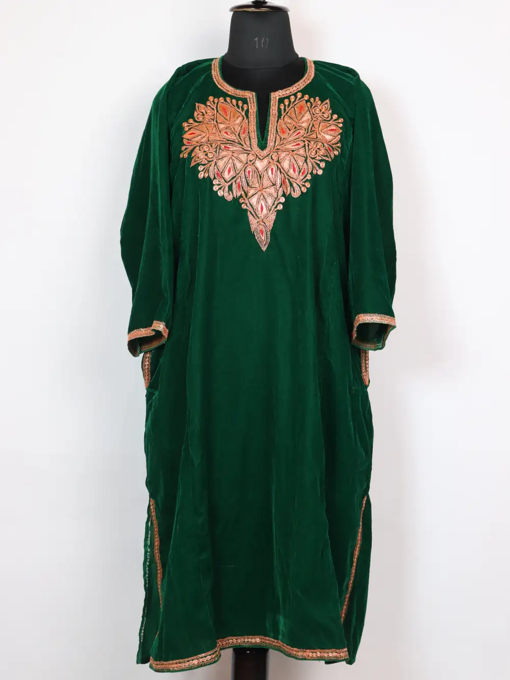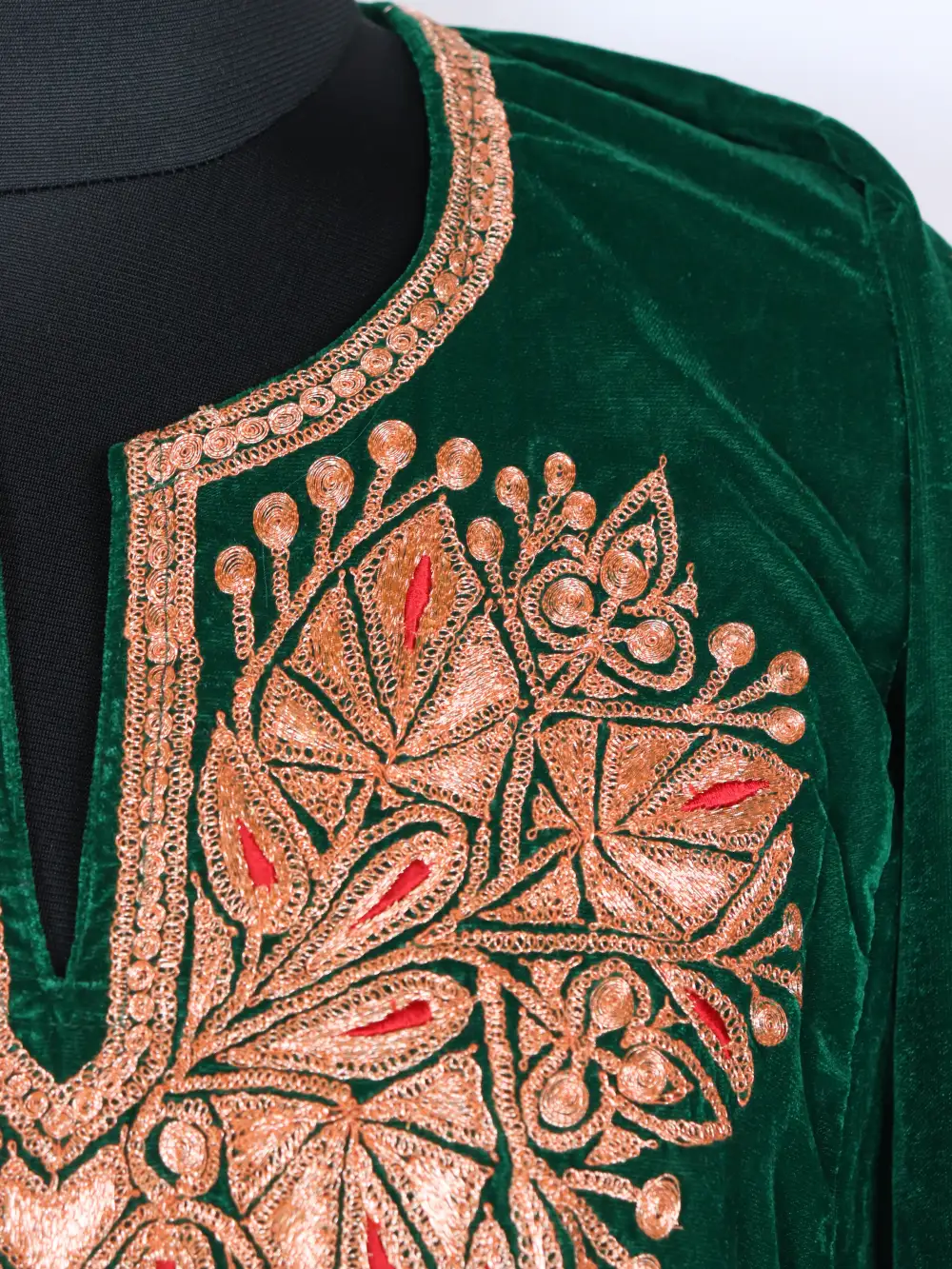 Makmal (Velvet) forms the base of this green Kashmiri Pheran, decorated with copper tilla Kadhai along the neckline. Two side pockets add functionality, while the 50-inch chest and 44-inch length ensure comfort and elegance. It is designed for winter, this phiran carries traditional charm and cozy warmth, which makes it a graceful option among pheran Kashmiri ensembles.