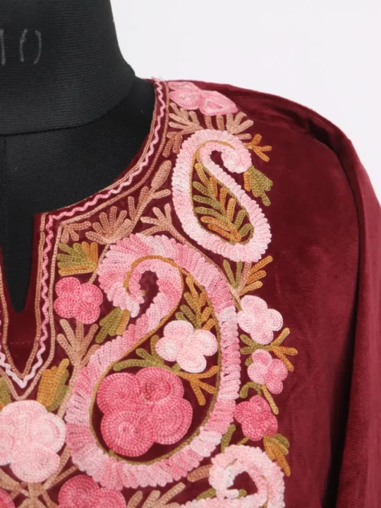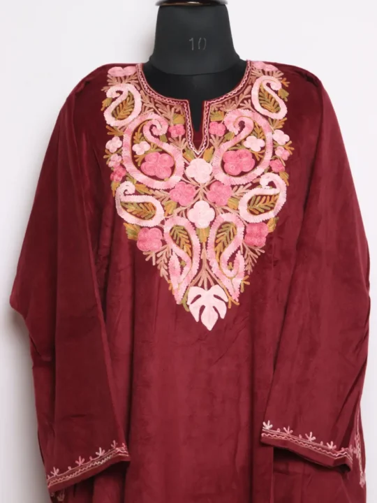 Velvet finish and a Aari kadhai in pink hue threads give this Kashmir-inspired Pheran a refined presence; the neckline of this piece features pinkish badam florals and it measures to a 58 inch chest and 45 inch length for an easy drape. This Pheran keeps it simple while the neckline detail adds charm; you can pair it with plain bottoms for balanced styling. It’s a sensible pick when browsing pheran kashmiri categories for traditional work on velvet.