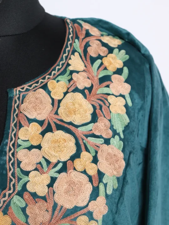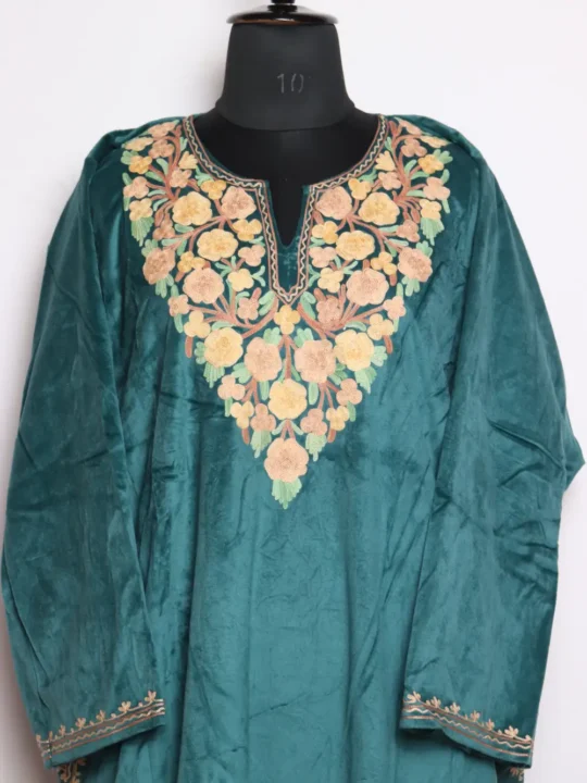 Makmal body with Aari at the V-shaped neckline defines this Kashmiri Pheran which is cut to a 60 inch chest and 44 inch length for comfortable winter wear. This Pheran carries a gentle kaam which features floral motifs in green and brown shaded threads. Choose this sea green fheran when you want subtle artistry on velvet and when searching phiran kashmir for simple trimmed pieces.