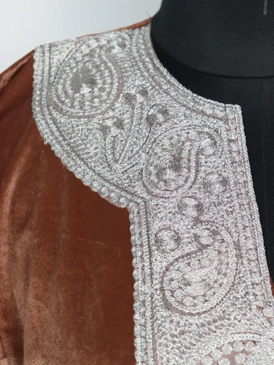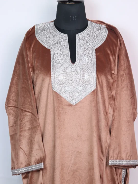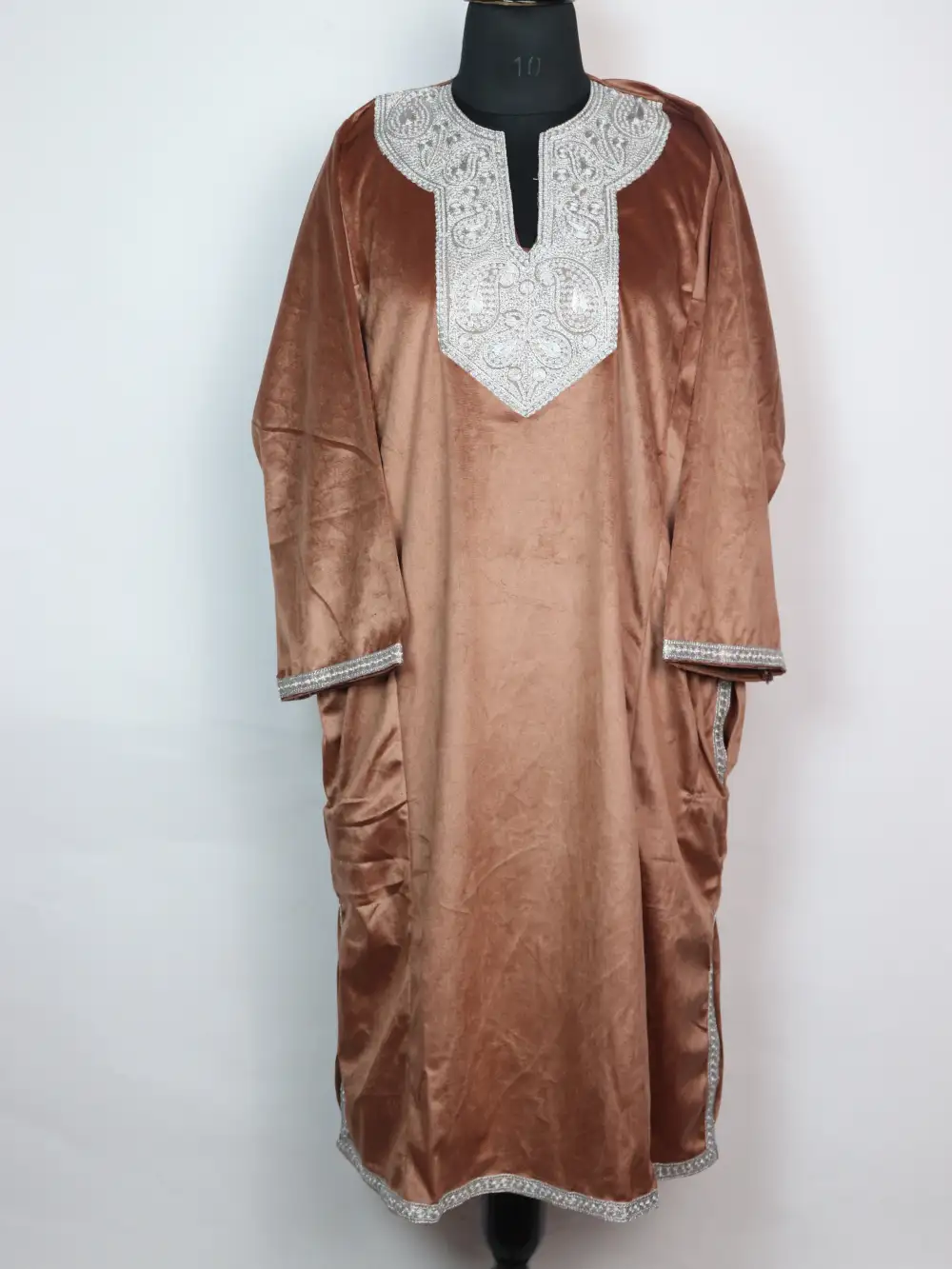 This faran is made from fine Holland velvet with elegant silver badam zari tilla kadhai around the neckline, giving it a traditional Kashmiri look. It comes in a 56 inch chest and 46 inch length and has pockets on both sides. A comfortable option for winter days.