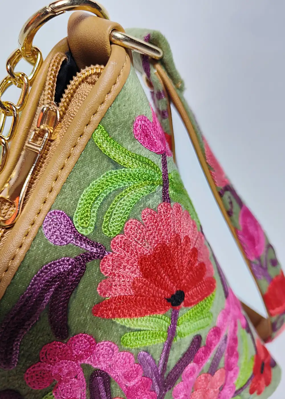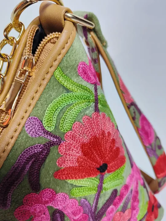Made in smooth velvet, this Green triangle potli bag comes with detailed floral and badam Aari work all over that adds a traditional touch. A perfect small bag to pair with ethnic wear during functions and gatherings.