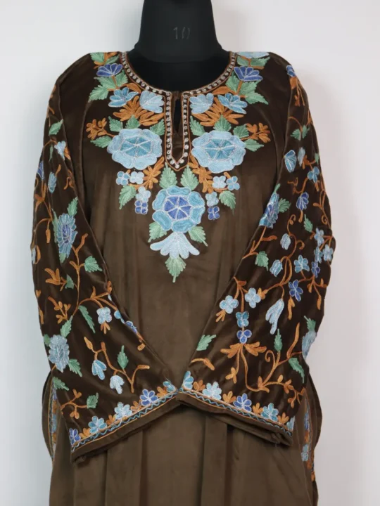 A green kashmiri traditional pheran dress in Velvet shows Zari and Aari kaam at neckline and sleeves and it includes pockets on both the sides for everyday practicality. This kashmiri traditional dress is ideal when warmth and neat ornament are both needed.