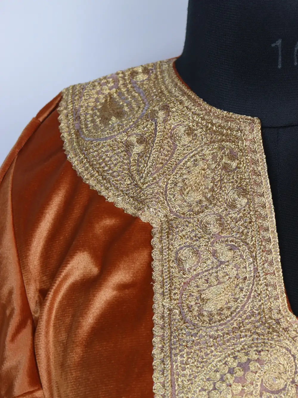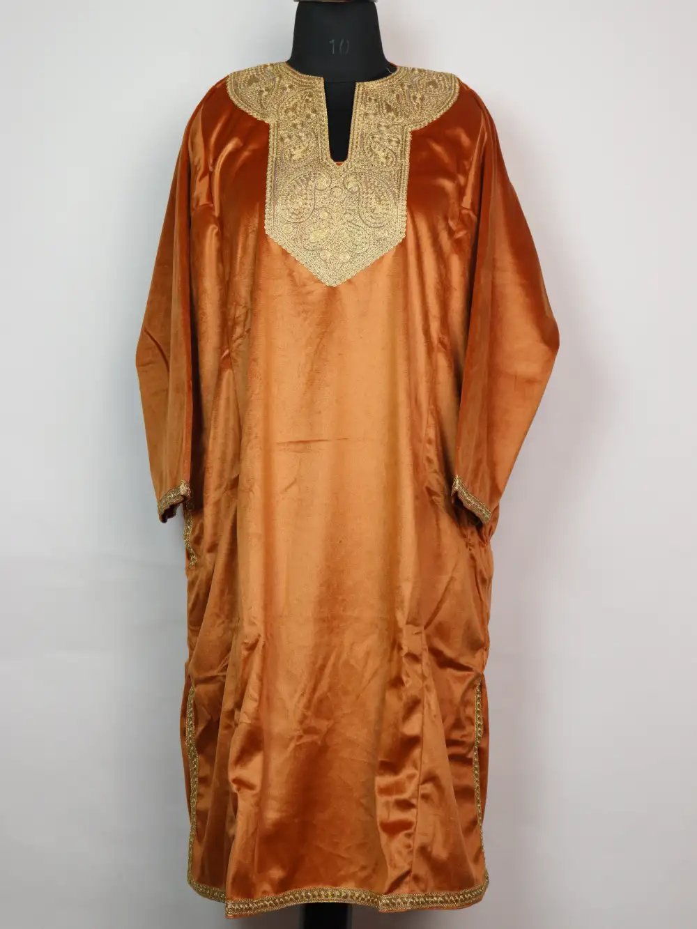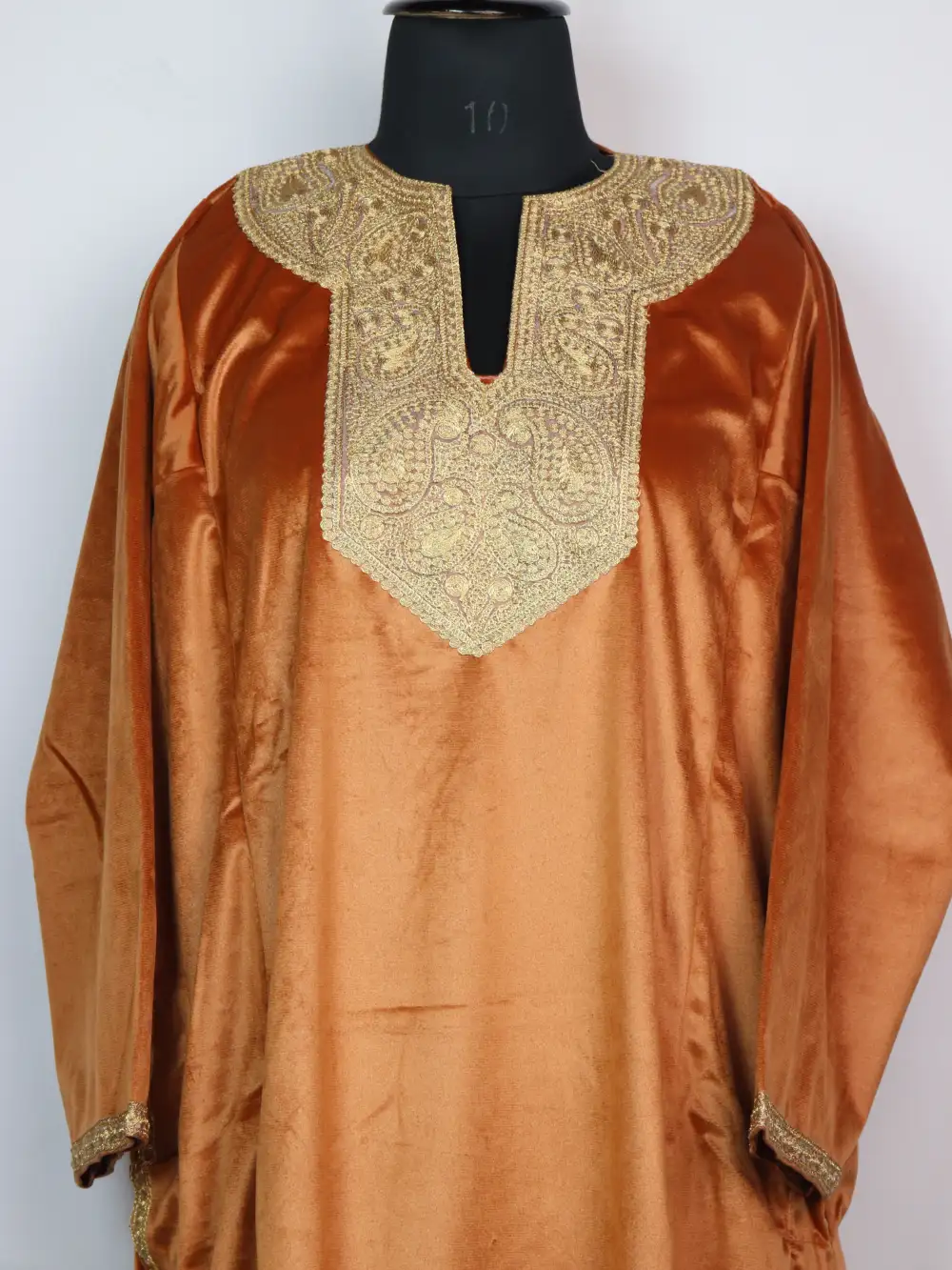 Made in rich Holland velvet, this pheran carries fine badam detailing in zari tilla kadhai at the neckline that keeps the look clean and graceful. Two side pockets are added.