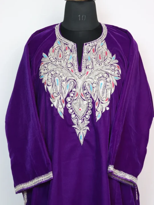 Plush makhmal velvet in rich purple and botte Tilla floral badam work around the neckline give this stylish kashmiri pheran a ceremonial glow; Its chest size 50 inches and Length 45 inches ensure ample, graceful drape.