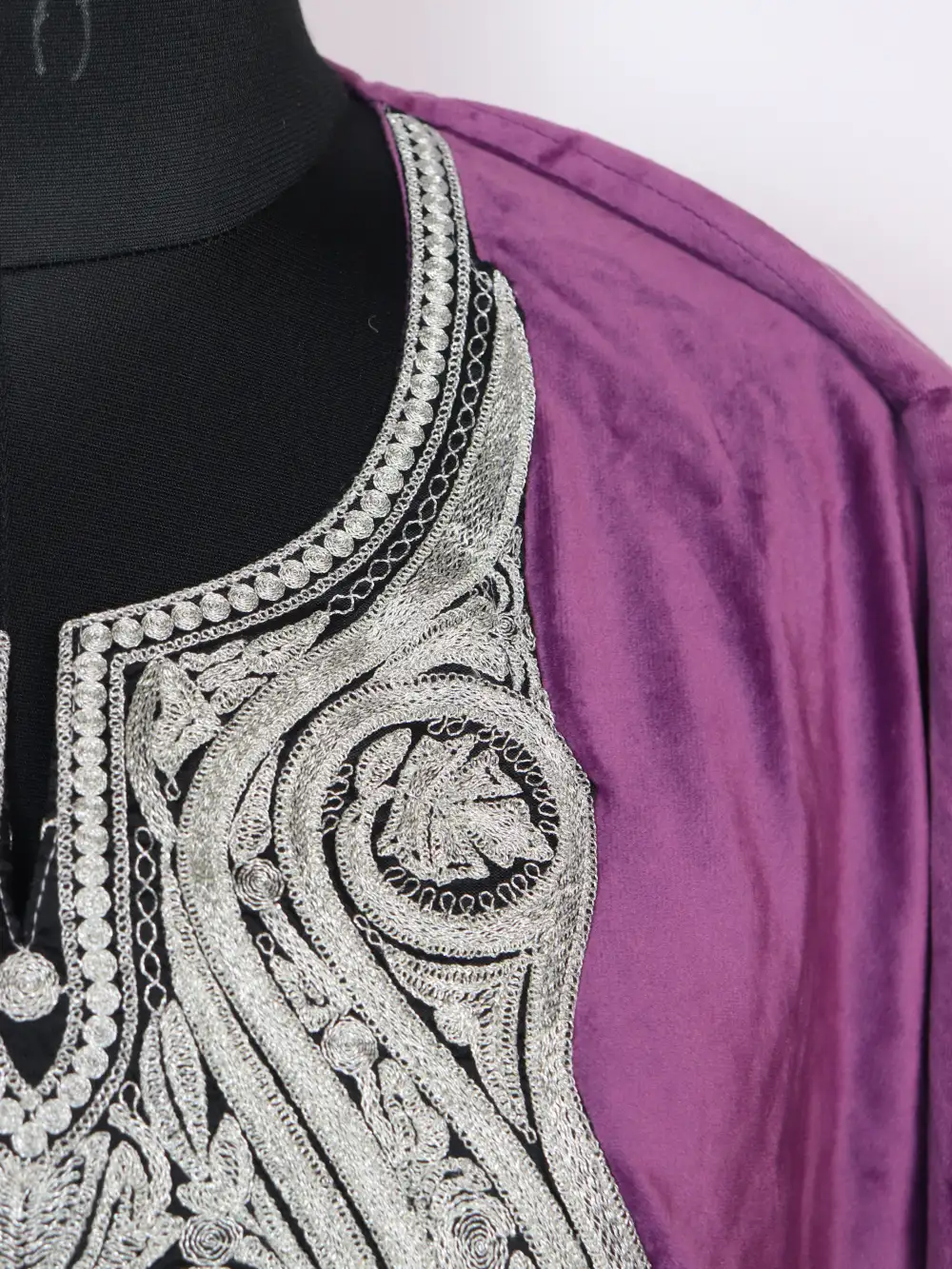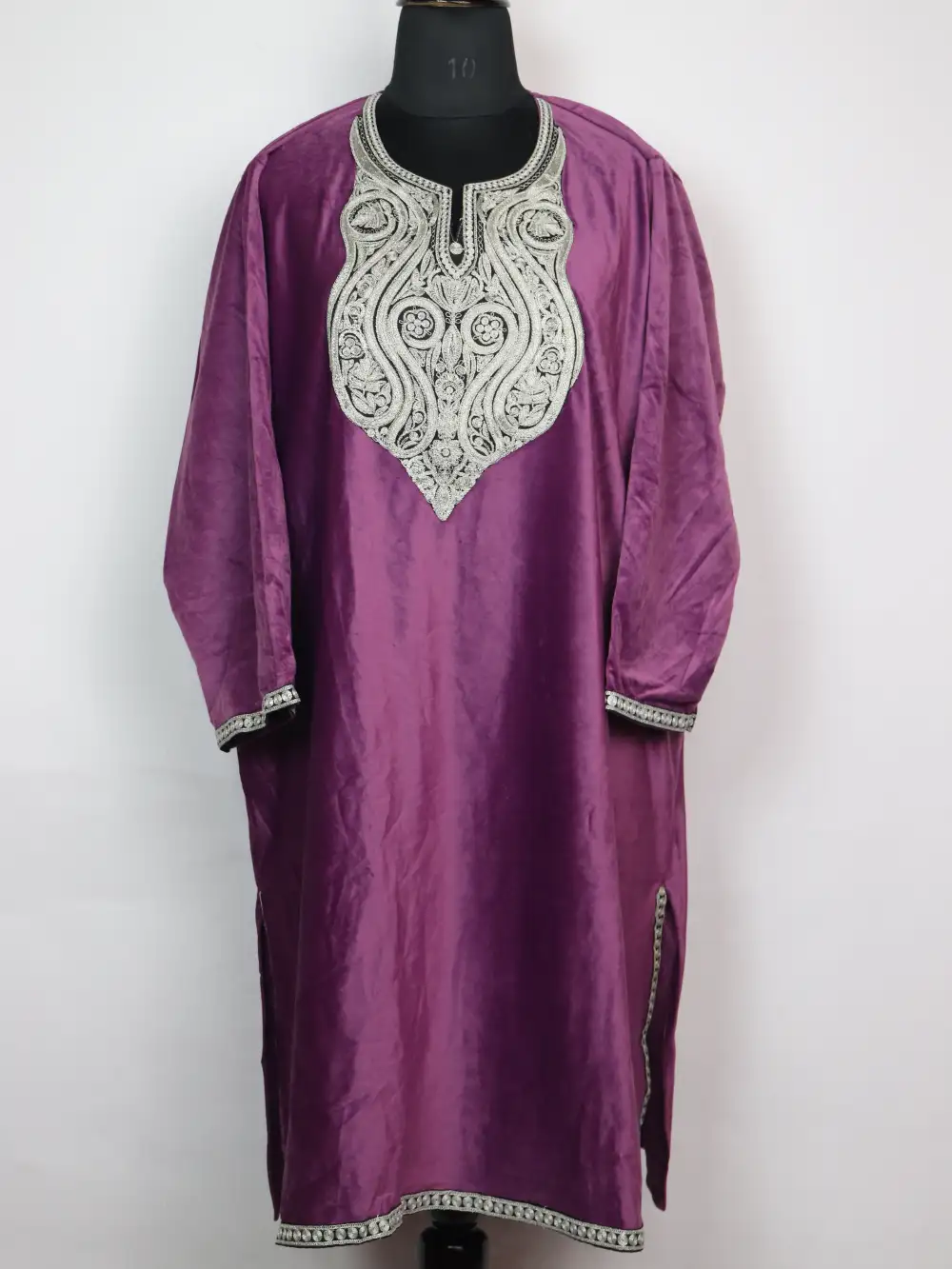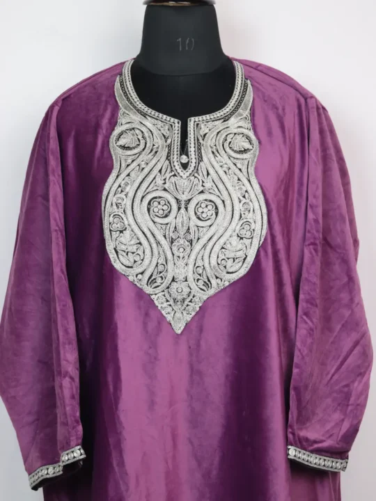 This Holland velvet pheran has badam zari tilla kadhai on the neckline that suits well with the cloth. It measures 58 inches at the chest and 46 inches in length, and you’ll find pockets on both sides. A warm and easy choice for everyday wear.