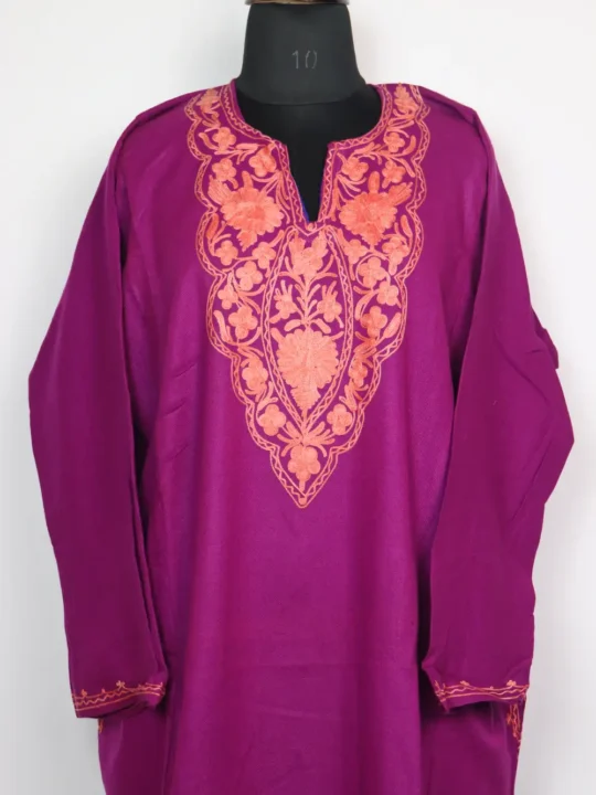 Cashmilon wool gives this violet Kashmir phiran a warm, reassuring weight. At the neckline Aari embroidery is worked into repeated blossom motifswhich add depth and rhythm to the front. Chest size 53 inches and length 45.5 inches provide a balanced fit.