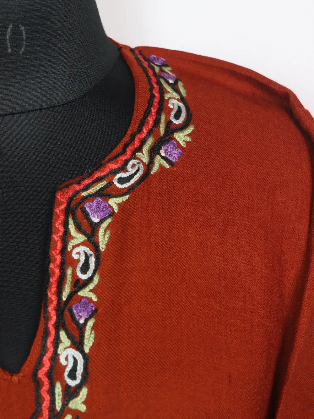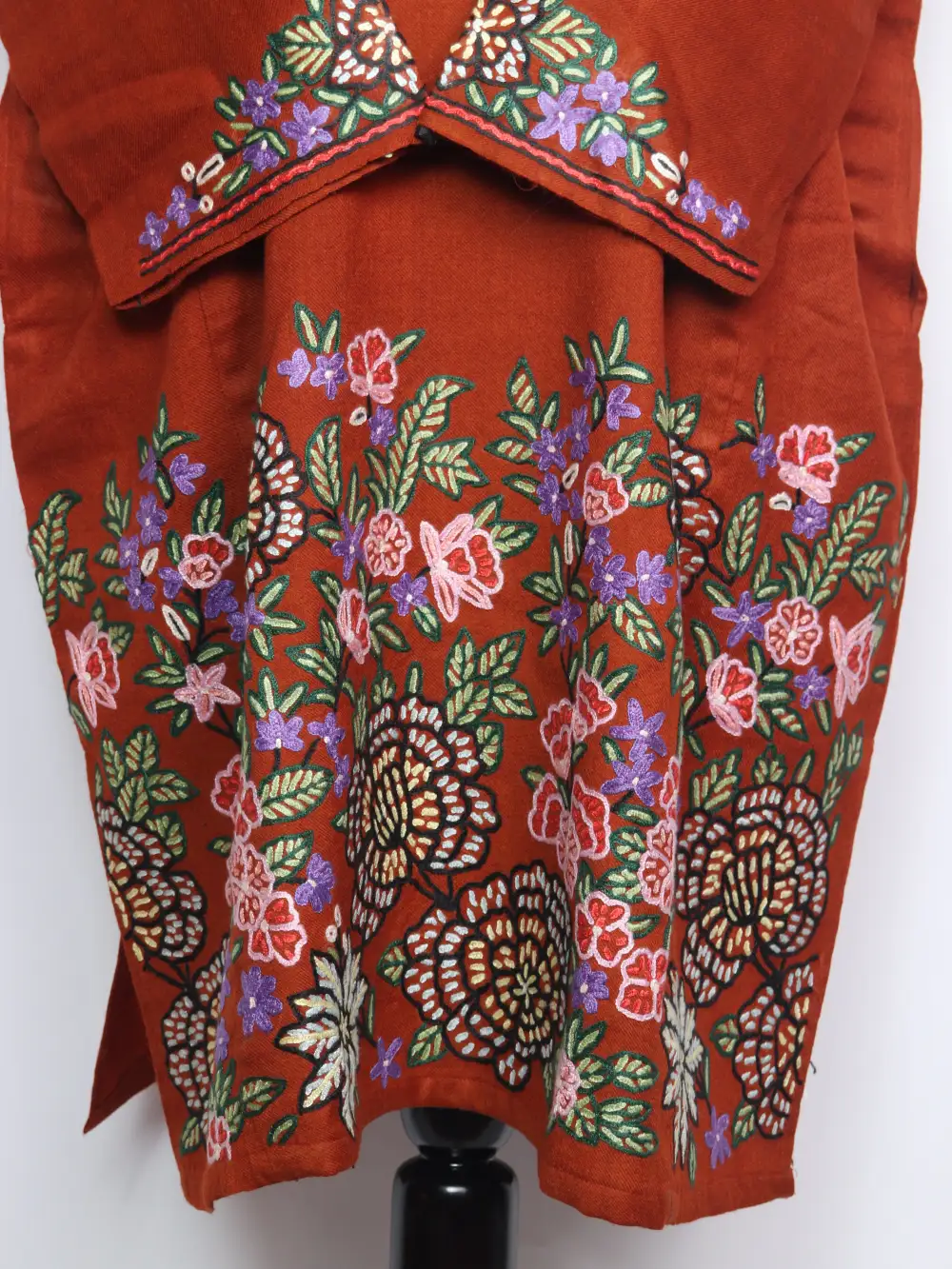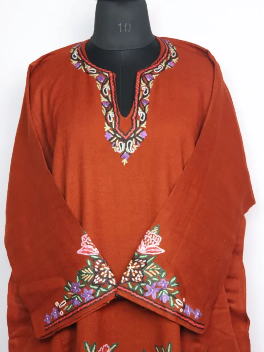 Made in raffal wool. this brown hue phiran offers hand Aari work at the neckline and sleeve bootis formed by tiny blooms and connecting vines, and the embroidery is spread all over daman to give it elegant look. It includes pockets on both side for functionality.