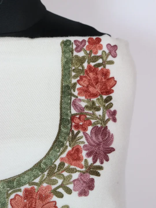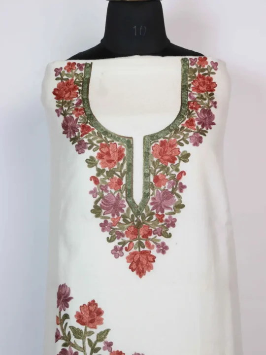 Floral embroidery at neckline and and huge floral vine motif at front panel in green and brown threads enhance this unstitched 2pc Suit which is crafted from cashmilon wool. This 2pc white Suit combines cozy winter warmth with artistic Aari kadhai, makes it suitable for woolen unstitched suits and woolen suit fabric searches online which also makes It is perfect for a winter wardrobe. fabric)