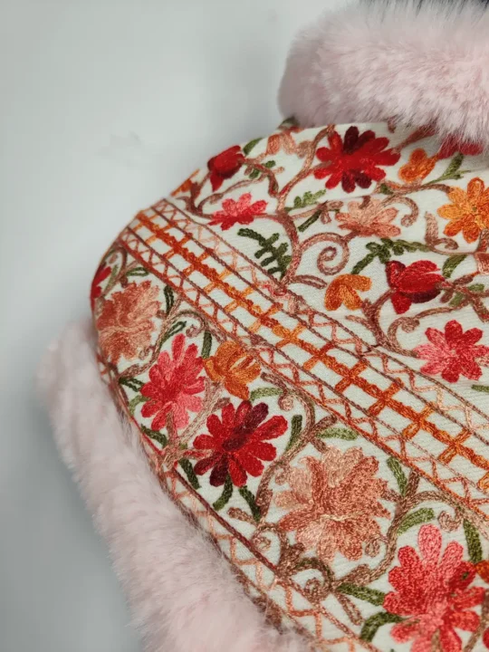 Wrapped in the softness of woolen Cashmilon, this kids white color Kashmiri poncho with fur edging is both cozy and refined. The Aari kadhai features all-over red florals , green leaf motifs with brown vines — delicate and lively. It is perfectly sized for girls, with 22 chest and 14-inch length, this piece adds a touch of nazakat and warmth for cold days.