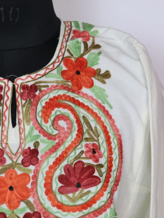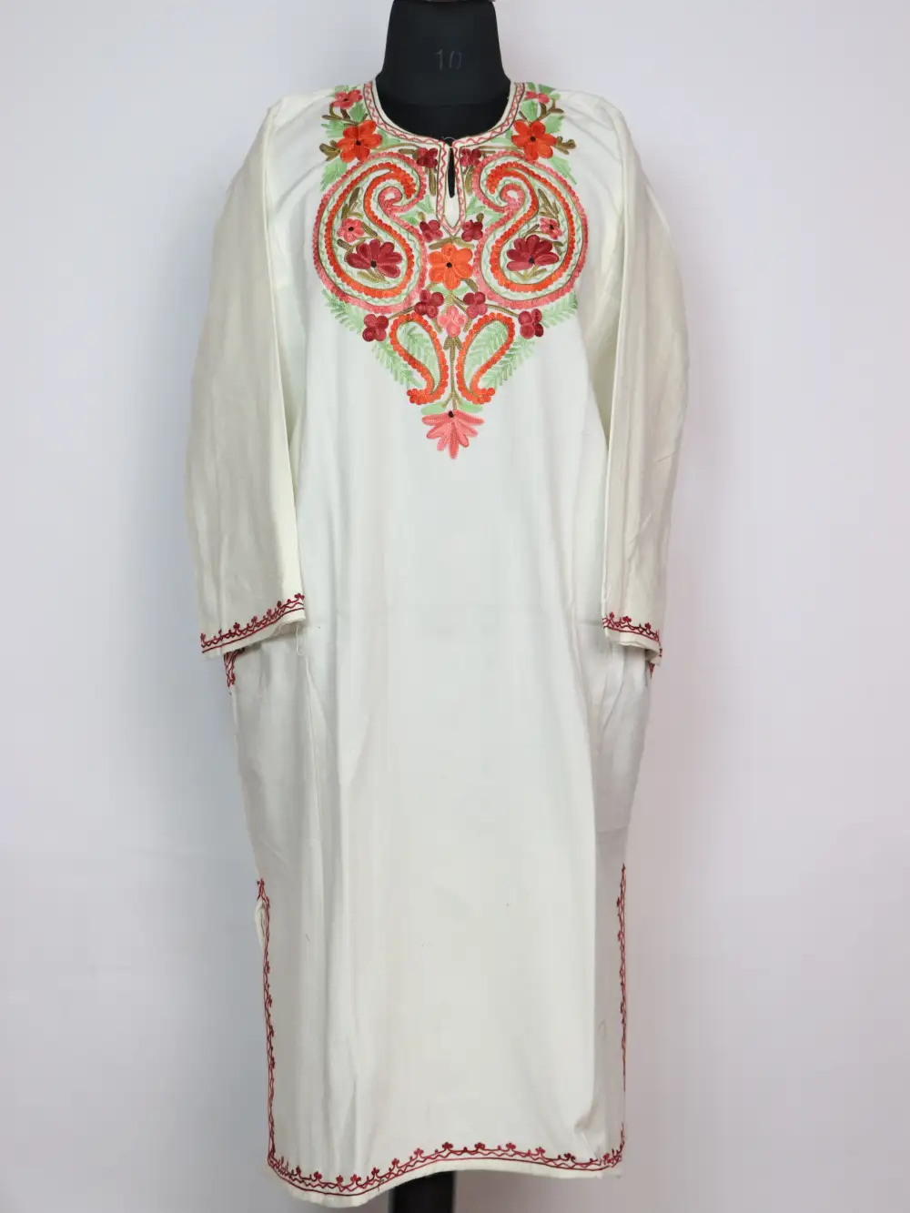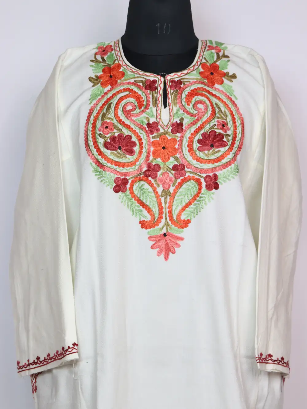 This beautiful Cashmilon wool pheran in white showcases elegant floral embroidery that enhances its colour. The soft wool keeps you warm, while side pockets add a modern, functional twist.