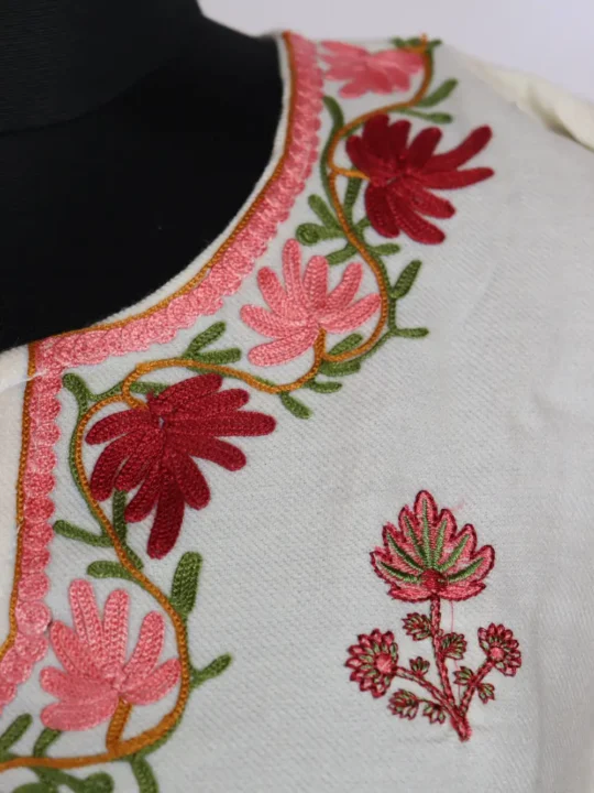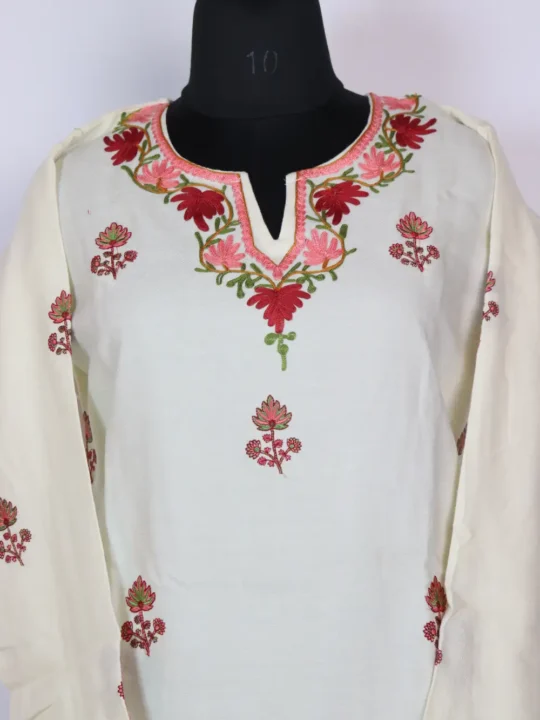 This white kurti in cashmilon wool carries both comfort and elegance. The neckline is decorated with floral Aari embroidery in red and green threads, while chinar motif bootis stitched in green sozni are scattered across the body. Its softness makes it easy to wear, while the embroidery brings charm to the design. Perfect for daily wear in winter, it blends practicality with graceful detailing.