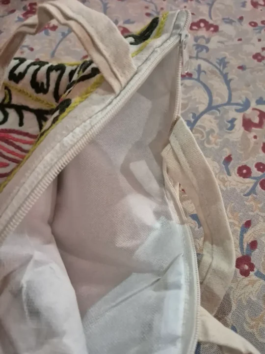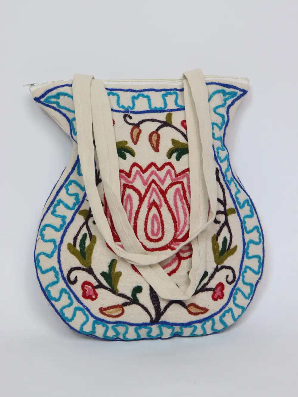 Every stitch on this dusoot bag tells a story of Kashmir valley, It has been crafted in cotton which features hand crewel work in floral motifs. Carry a piece of heritage, effortlessly chic.
