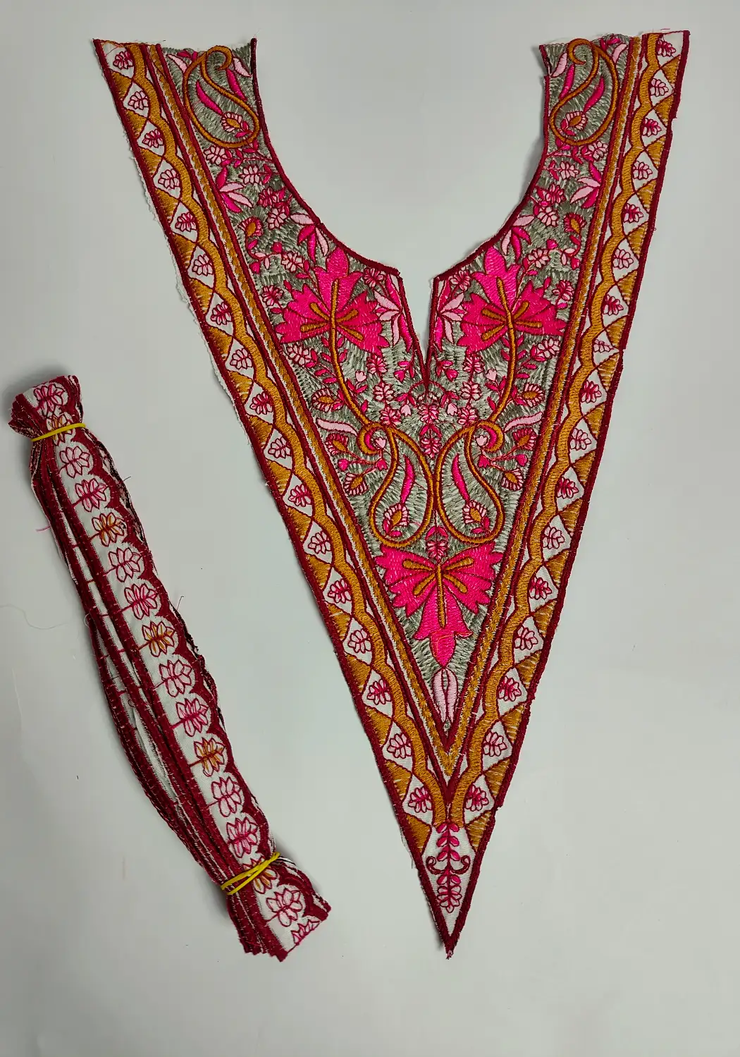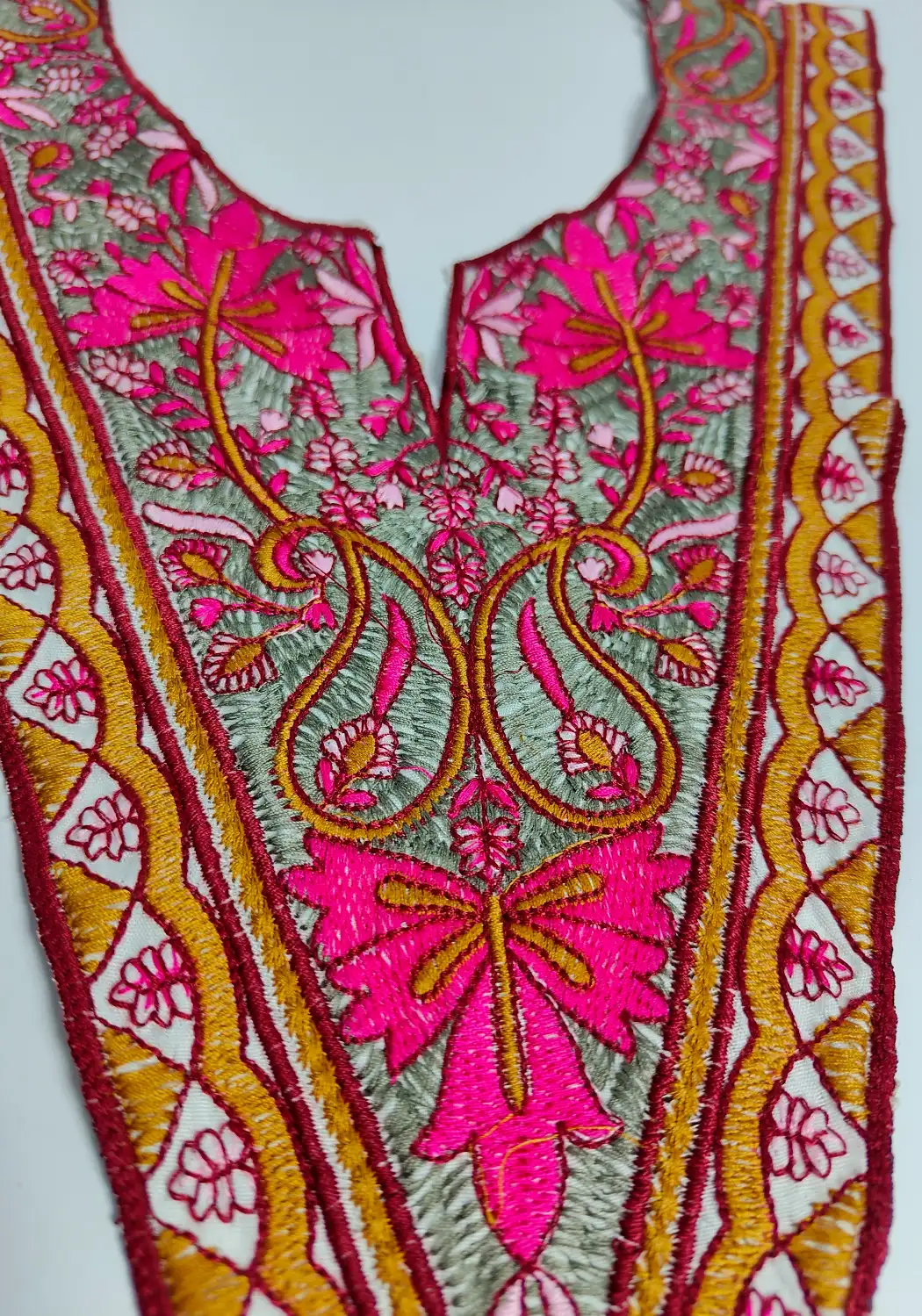 There’s a quiet richness in this white based sozni Kashmiri V shape patch set, where badam and floral embroidery flows across each element. Including neck patch and lace, it gives you the freedom to create a look that feels both detailed and rooted in tradition.