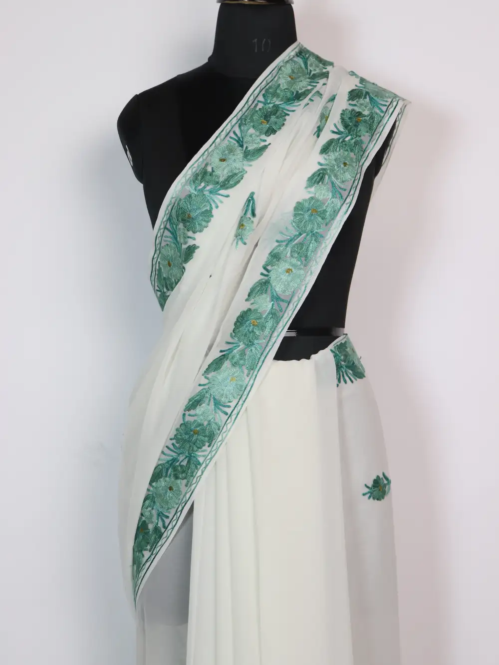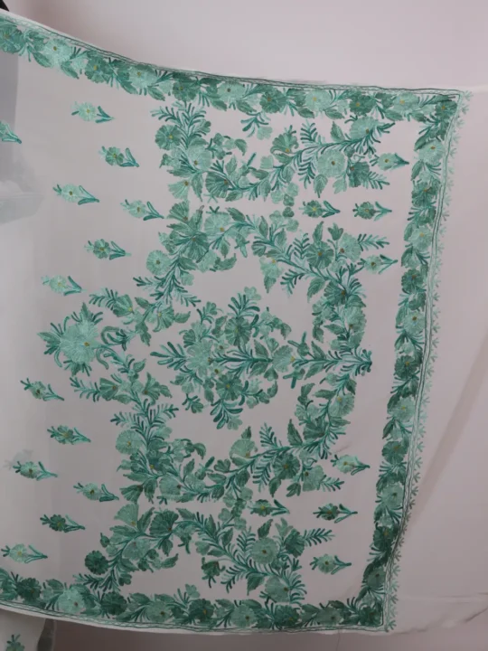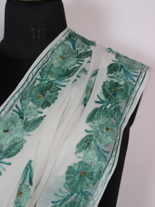 Elegant white georgette drapes this Ball Design Saree with a heavy Aari embroidered border and floral booti in light green threads, makes it a true georgette saree for refined occasions. This saree shows large floral motifs at the end of the pallu in careful Aari work, honoring Kashmiri stitch language. You can wear this saree for weddings or formal evenings where the heavy border frames it and the pallu finishes with bold floral statements.