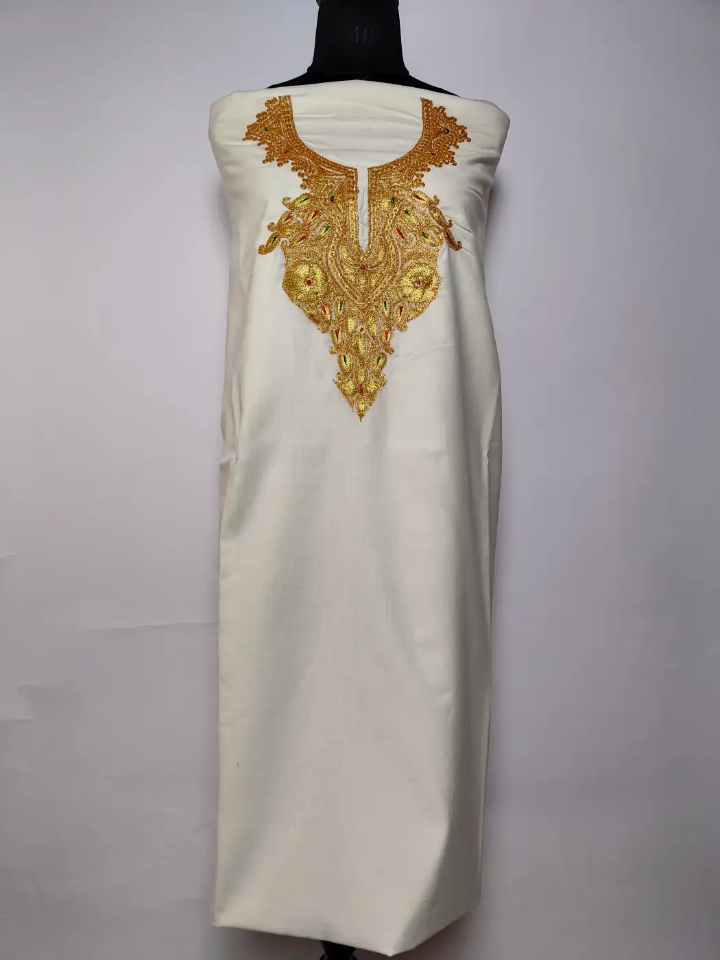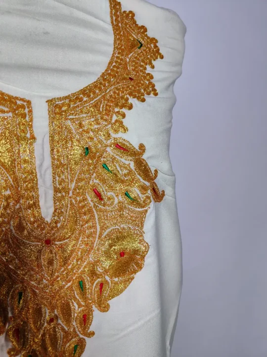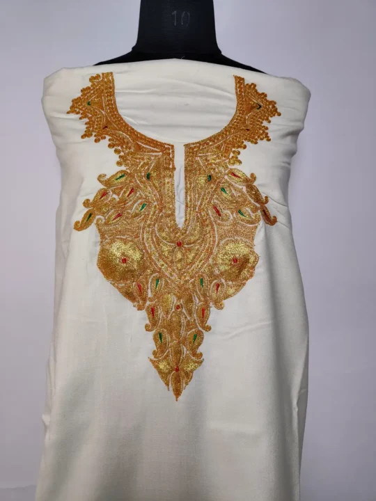 Rooted in tradition, this traditional Kashmiri 2pc suit features floral badam botte tilla embroidery that is placed neatly along the neckline. Crafted in white ruby cotton, this unstitched salwar kameez set lets you customise the fit while keeping the look classic and composed.