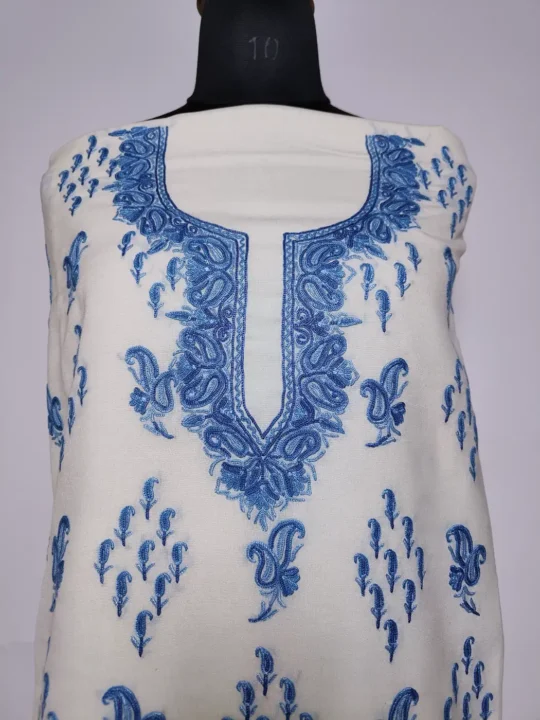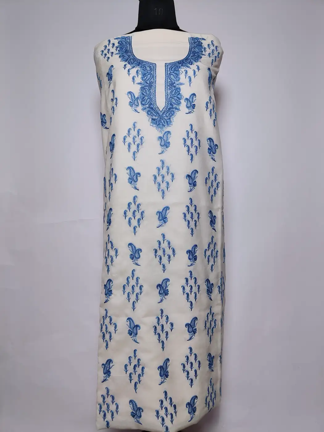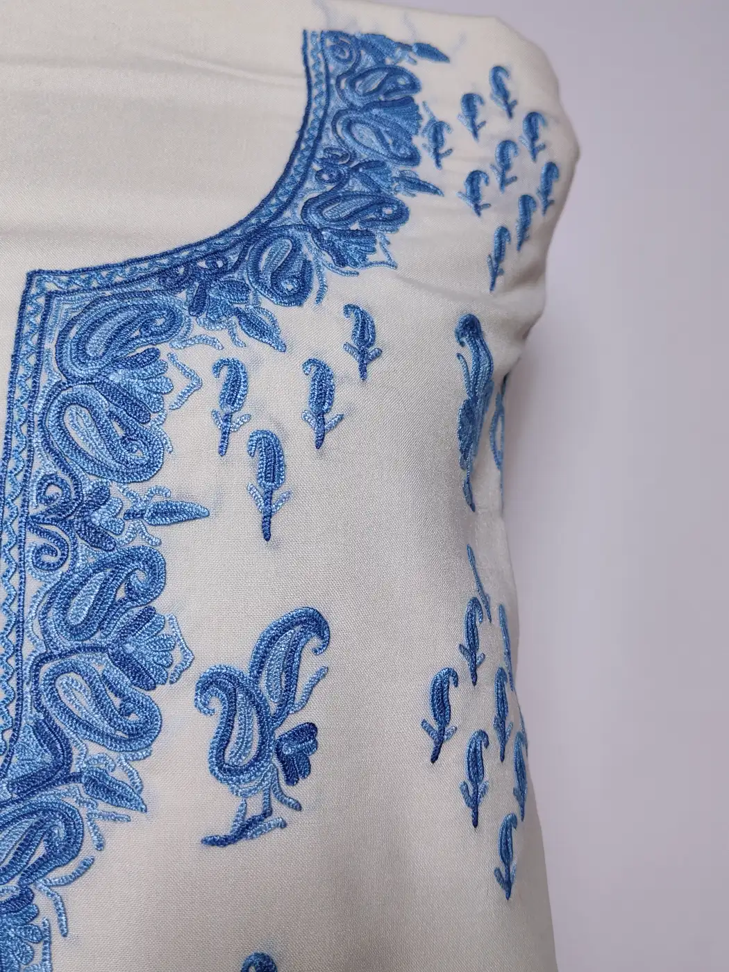 Floral aari embroidery which is done with hand softly highlights the all over of this Kashmiri unstitched suit. It is set on a white summer cool cotton base. The fabric feels smooth and comfortable. It includes kurti and trouser in unstitched form, which you to tailor the look just the way you prefer.