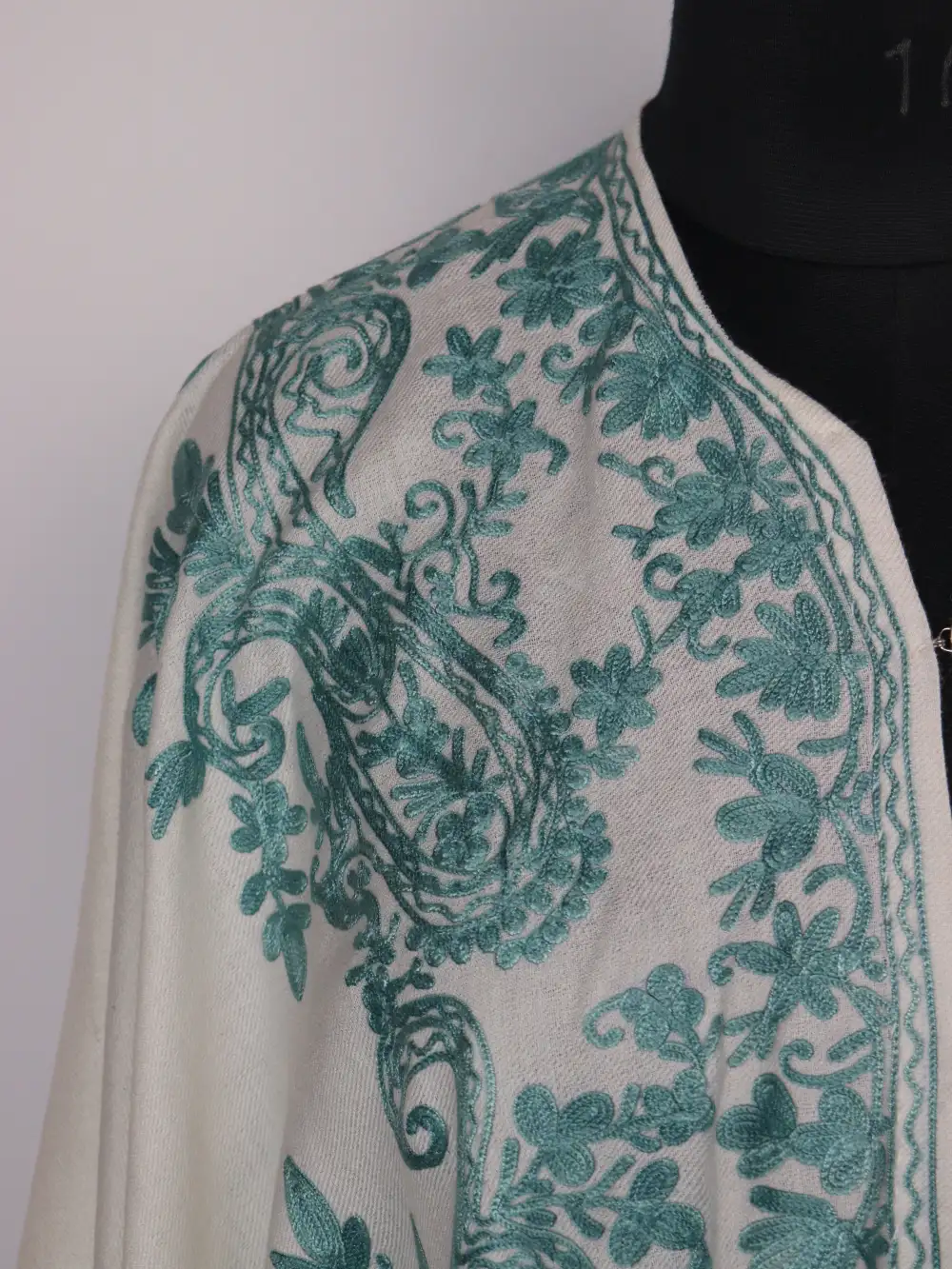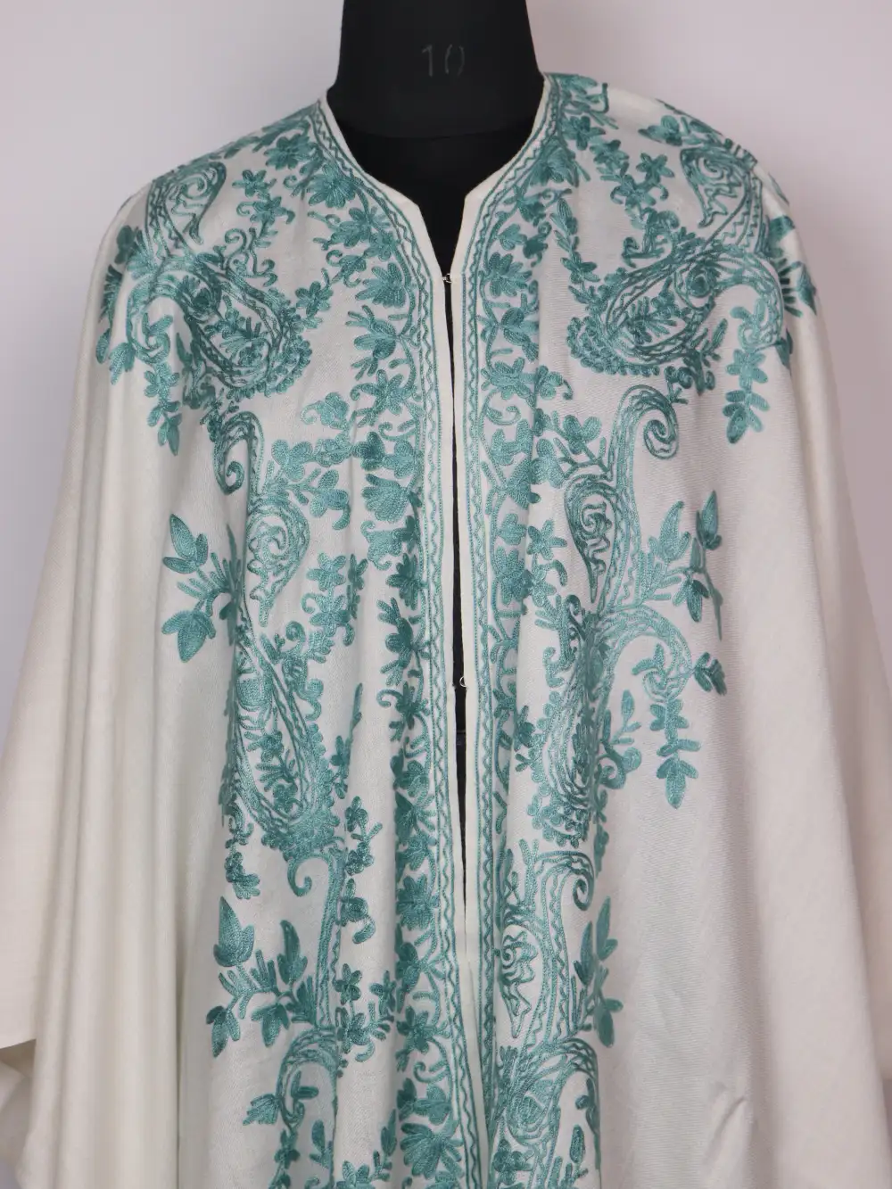 Gorgeous cape shawl in polywool fabric made in polywool, which makes it best for winters. It has been adorned with all-over aari embroidery and front back neckline in floral patterns.