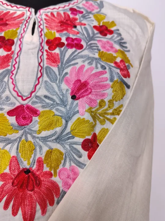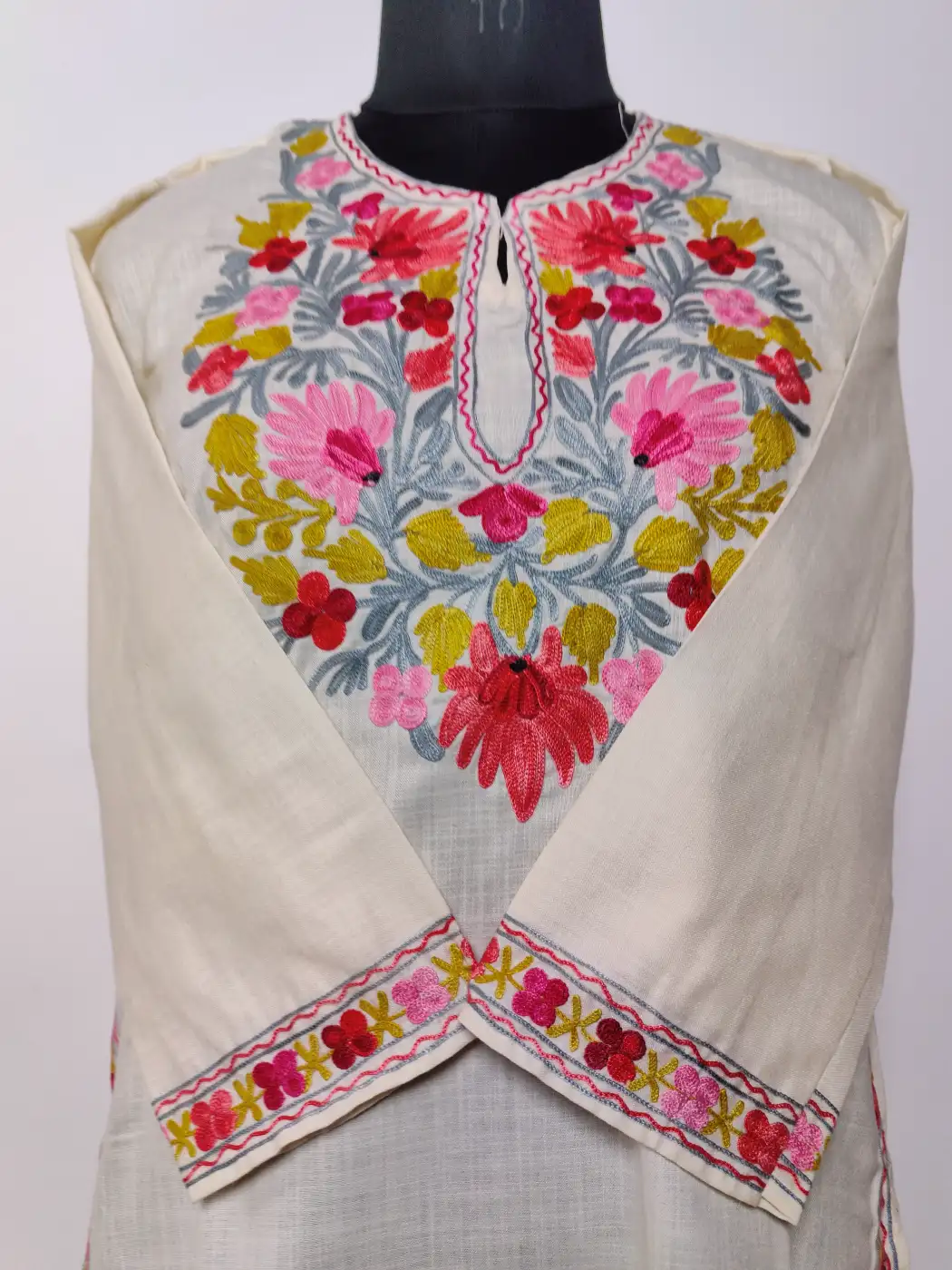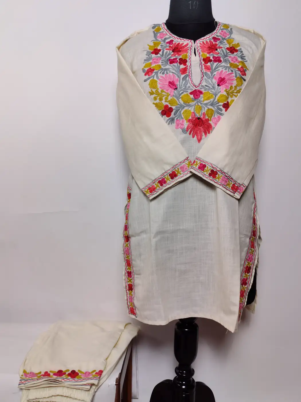At the neckline of this Kashmiri kadhai kurta set, floral embroidery draws attention, while sleeves also carry some work at cuffs. Crafted from white ruby cotton, it includes kurti and trouser, reflects understated Kashmiri craftsmanship.