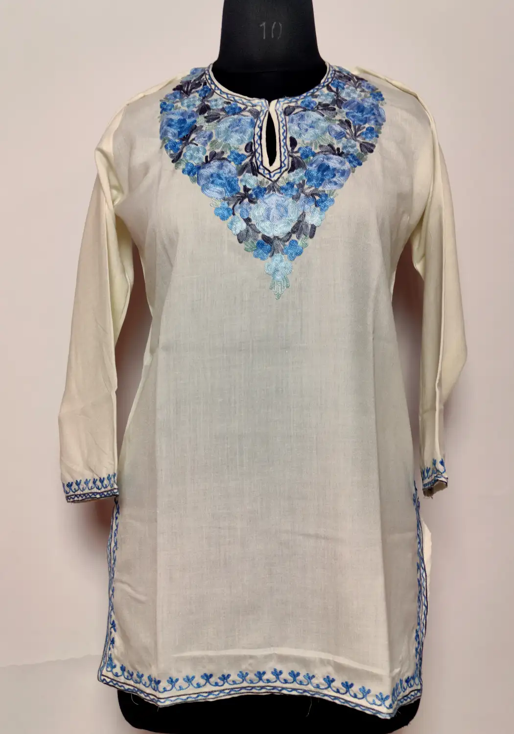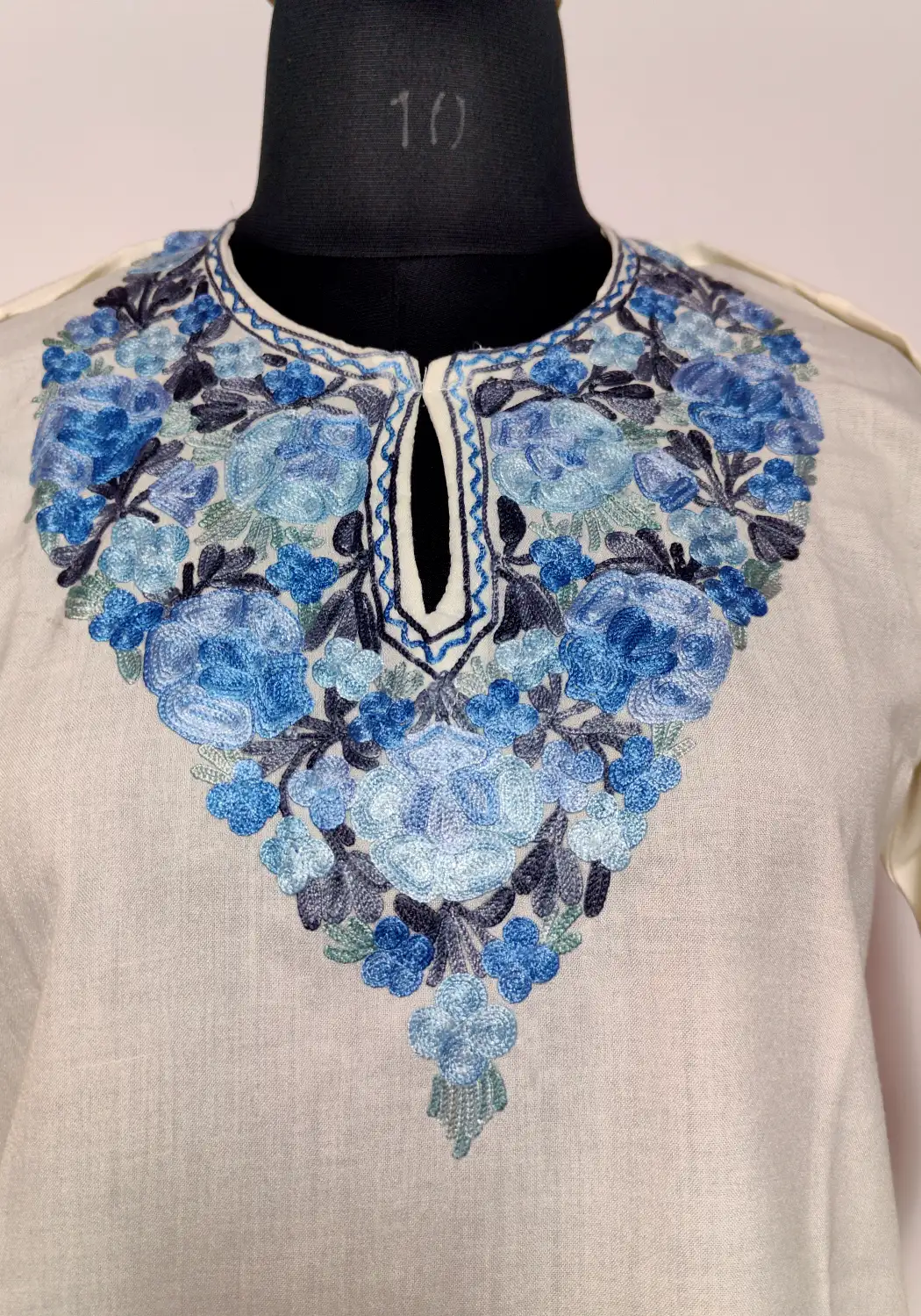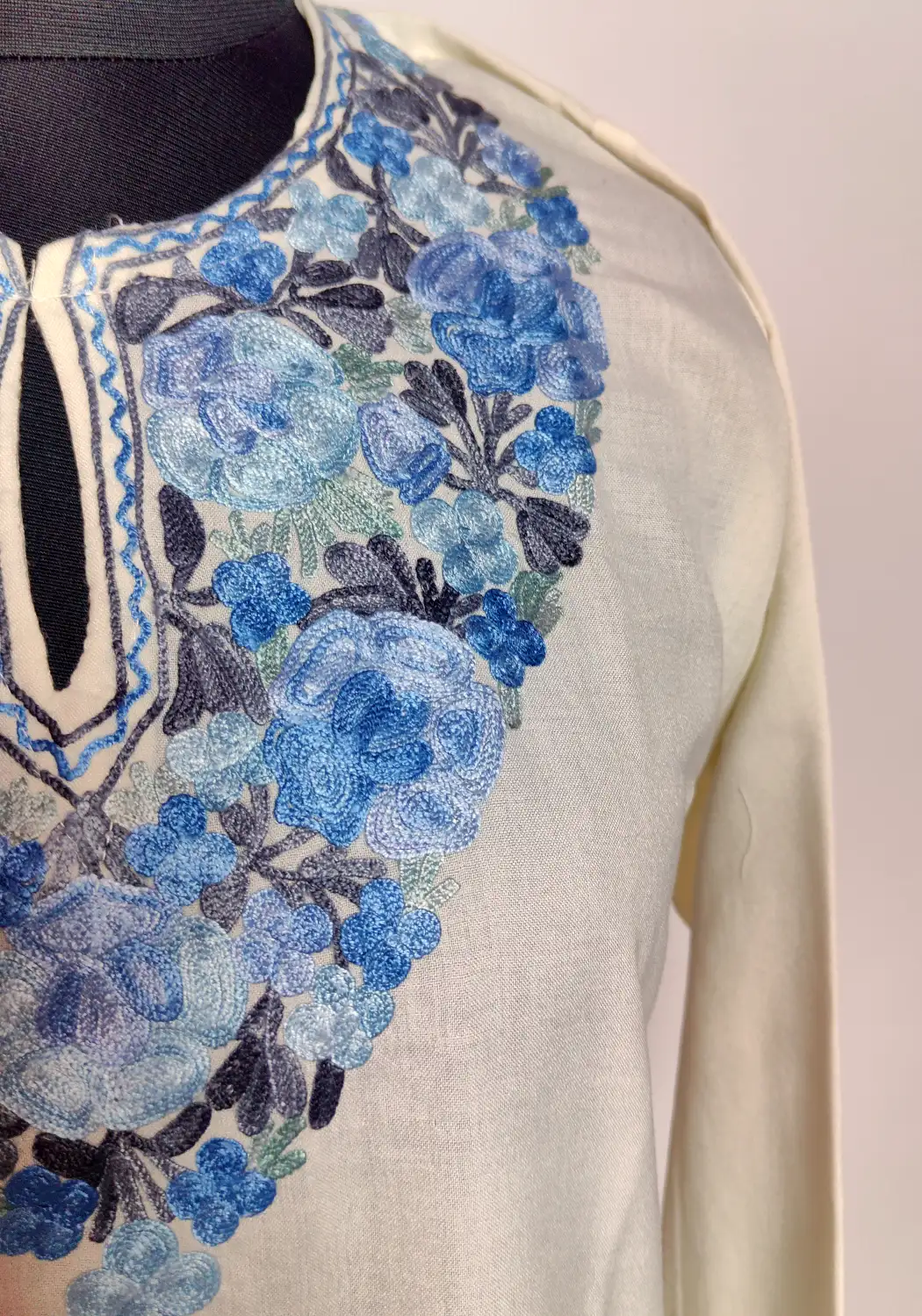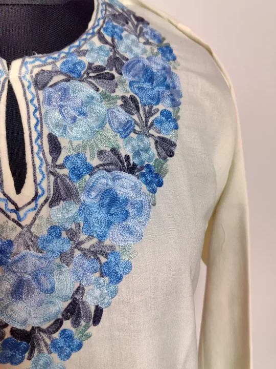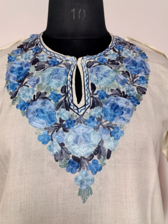This simple yet refined kurti is made from white summer cool cotton, offering comfort throughout the day. The neckline features floral aari embroidery, which adds a touch of detail. It feels light, wearable, and quietly rooted in traditional Kashmiri styling.