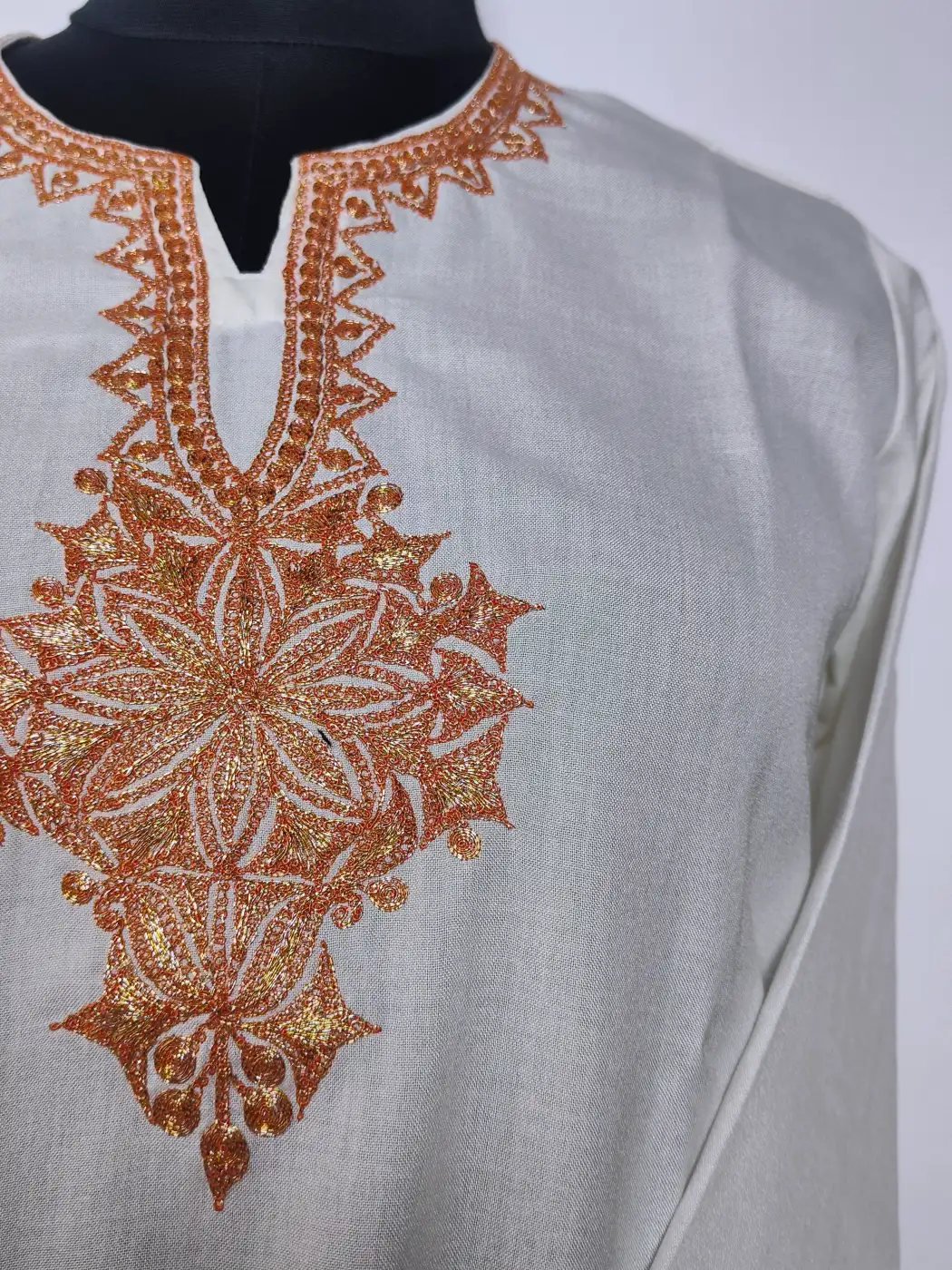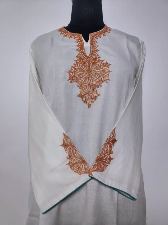 Floral botte tilla embroidery draws attention to the neckline of this white Kashmiri kurti coord set, while badami booti patterns decorate the sleeves. Crafted in white summer cool cotton, it includes kurti and trouser for complete set.