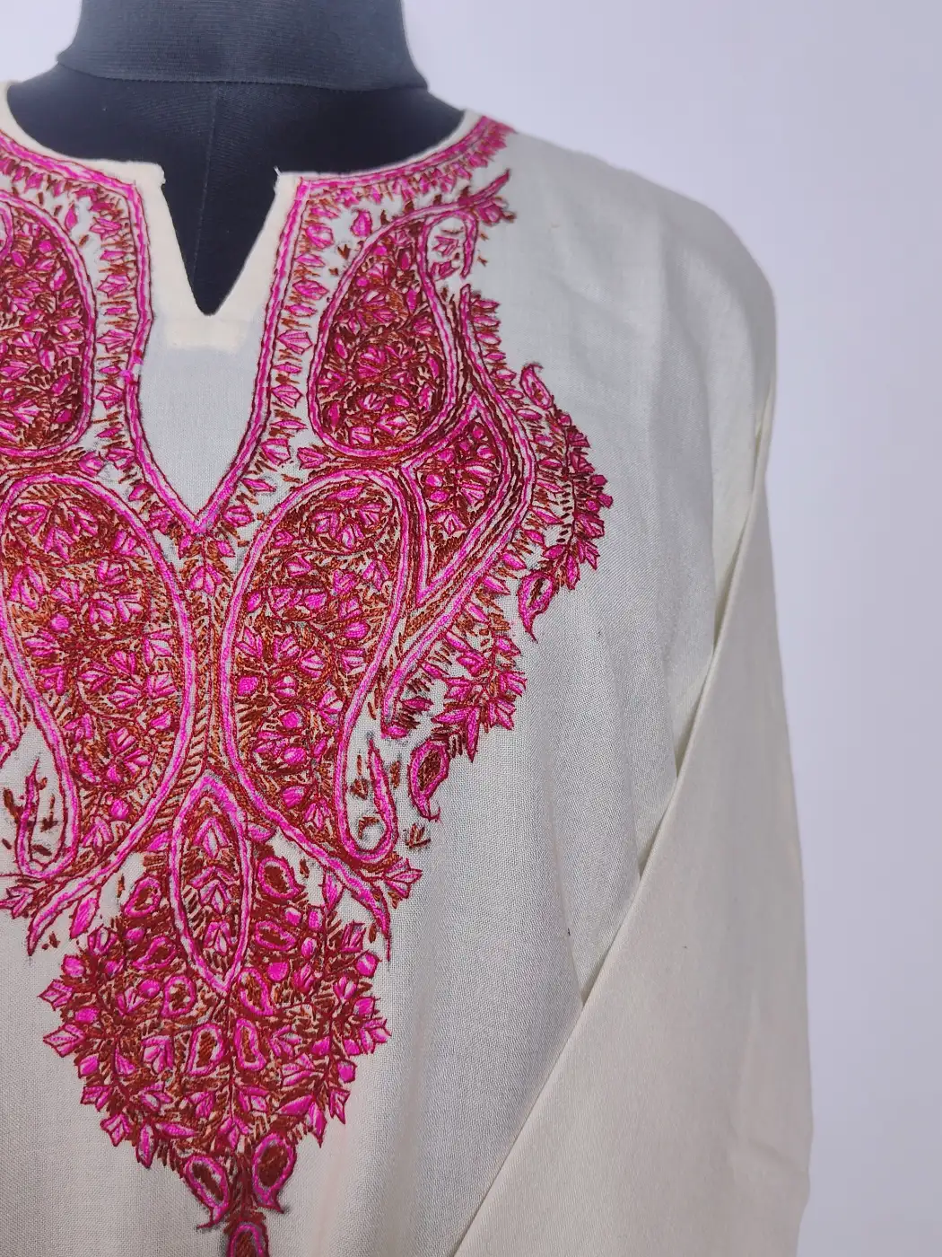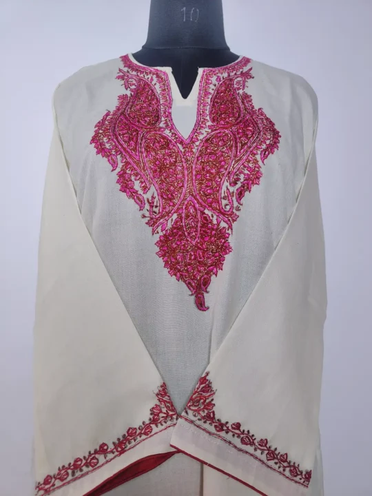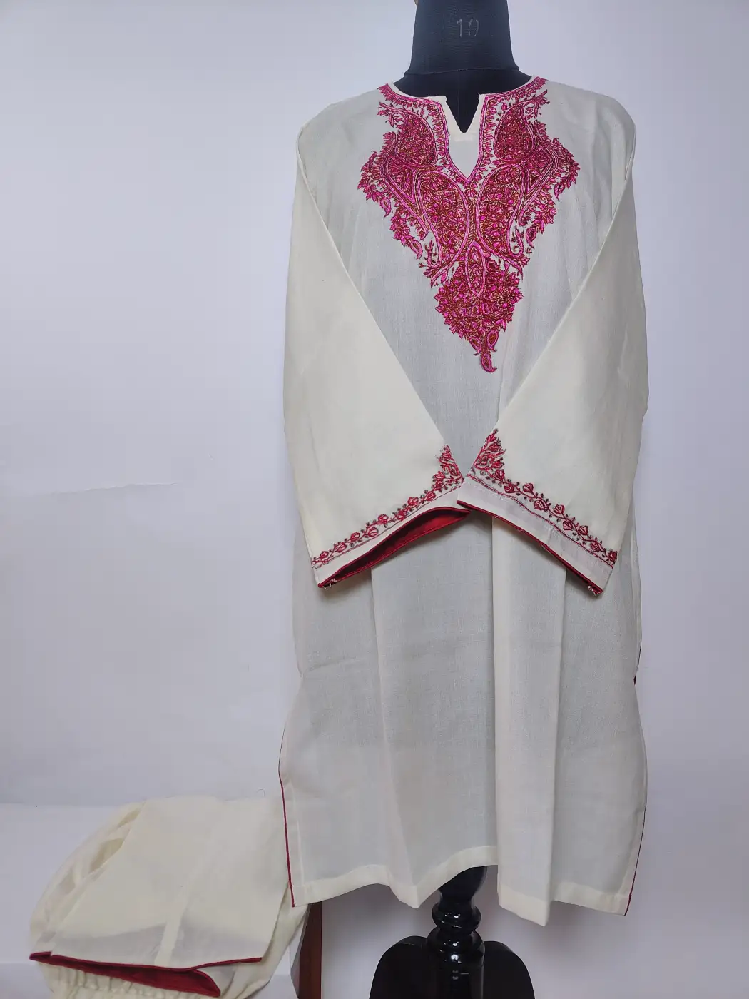 Designed for ease, this office wear kurti set comes in white summer cool cotton with hand sozni embroidery. Floral and curved detailing highlights the neckline while sleeves carry soft lakeer work.