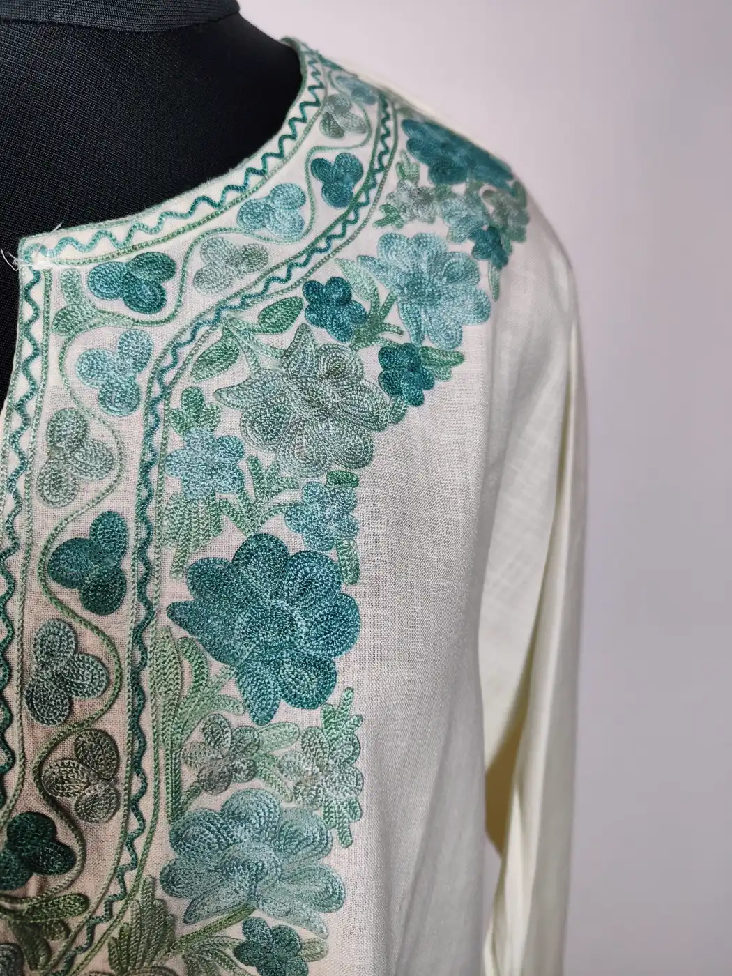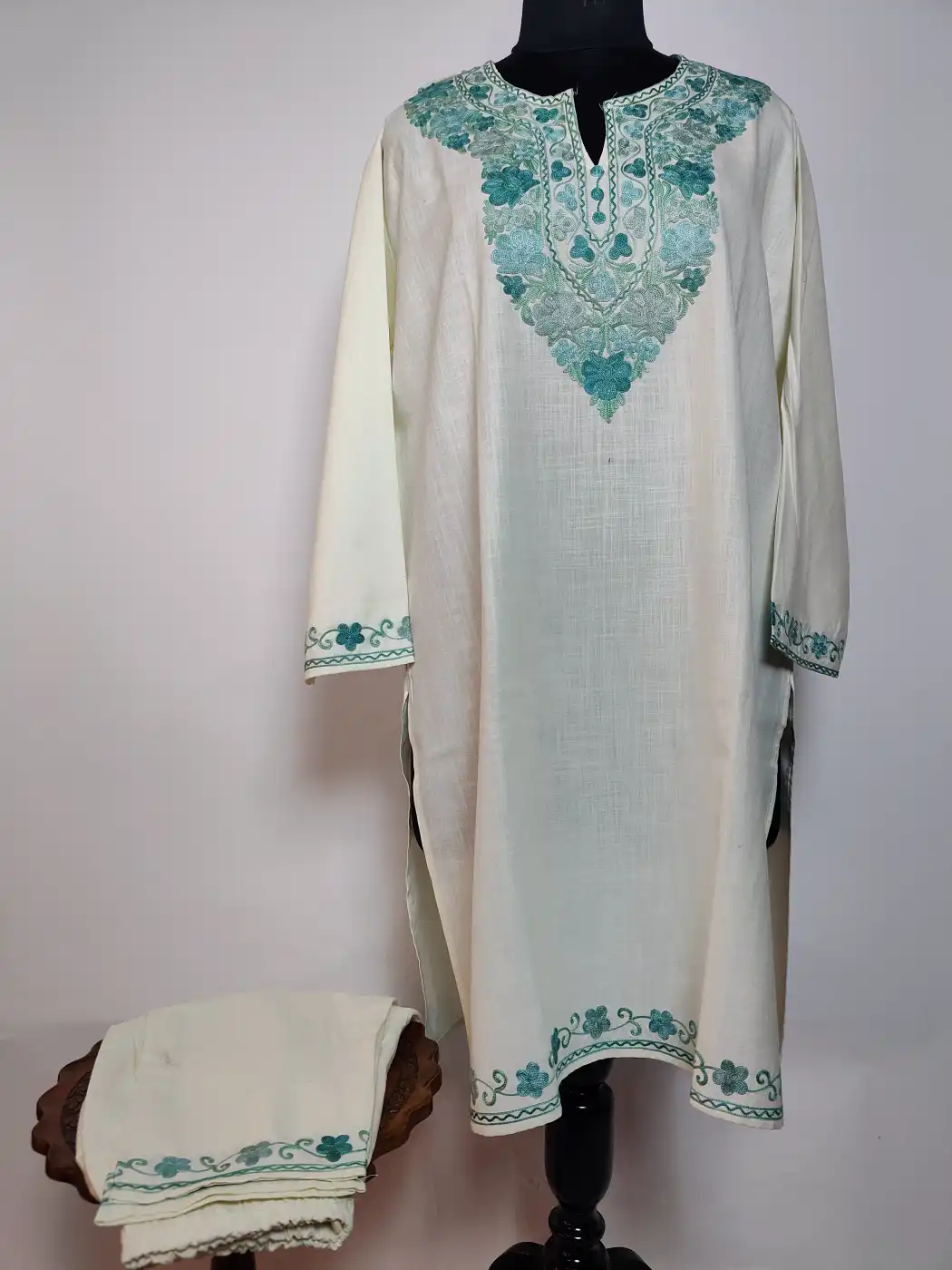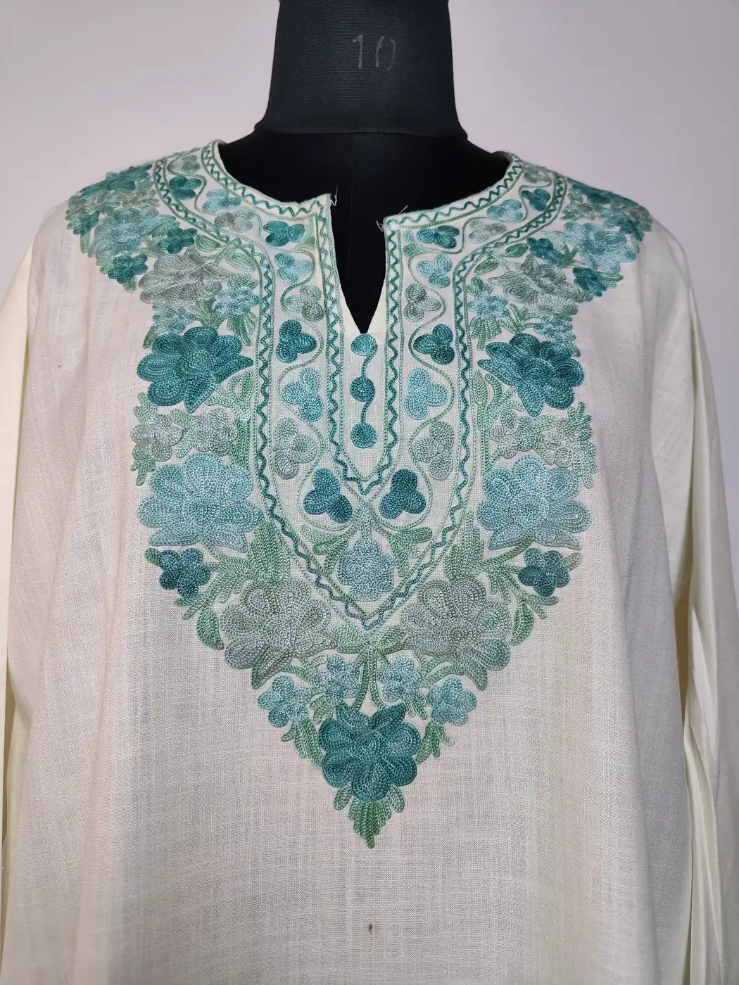 Made in summer cool cotton for comfortable wear, this Kashmiri white colour kurti set features aari embroidery at neckline in continuous floral motifs. It includes kurti and trouser and comes 48 inches chest size and 40 inches length.