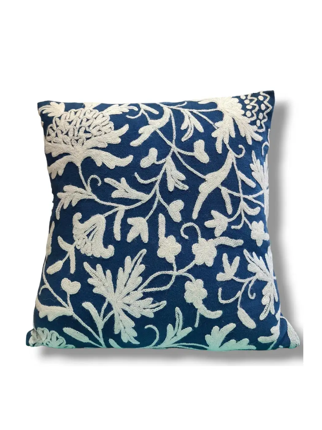 White on Blue Kashmiri Hand Embroidery Crewel Cushion Cover – Set of 2 (16×16 Inches)