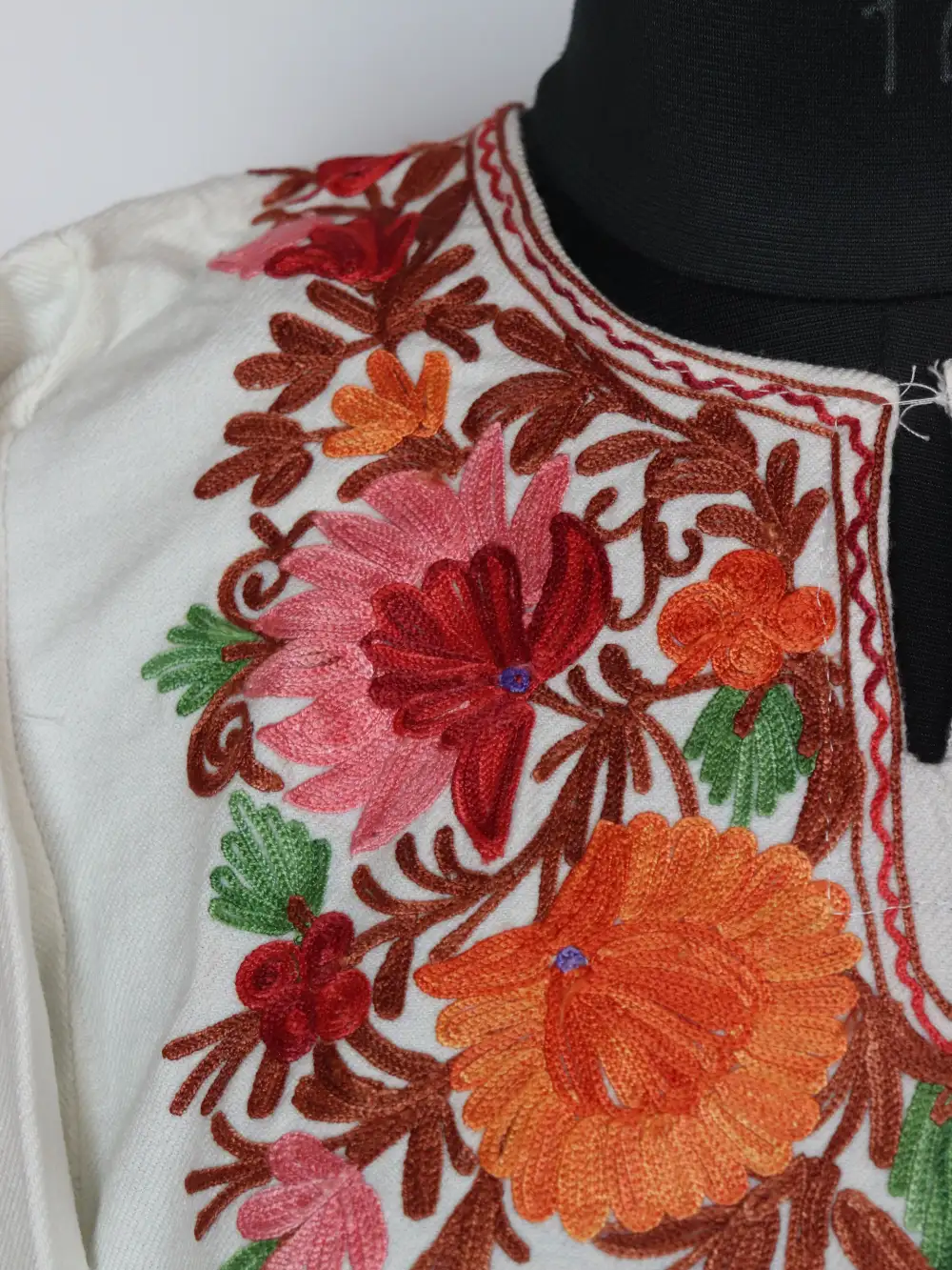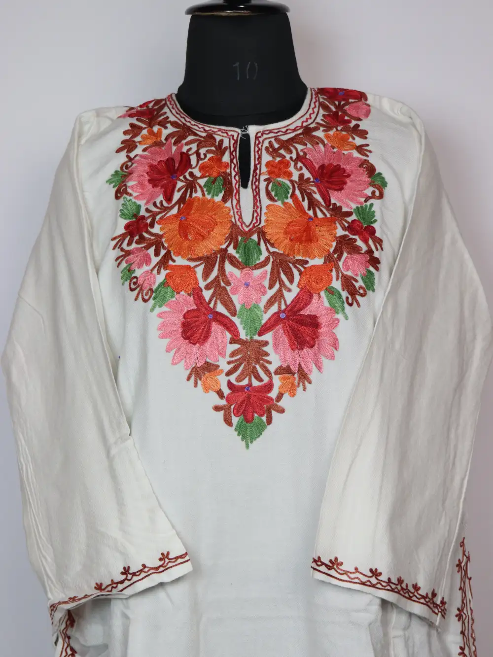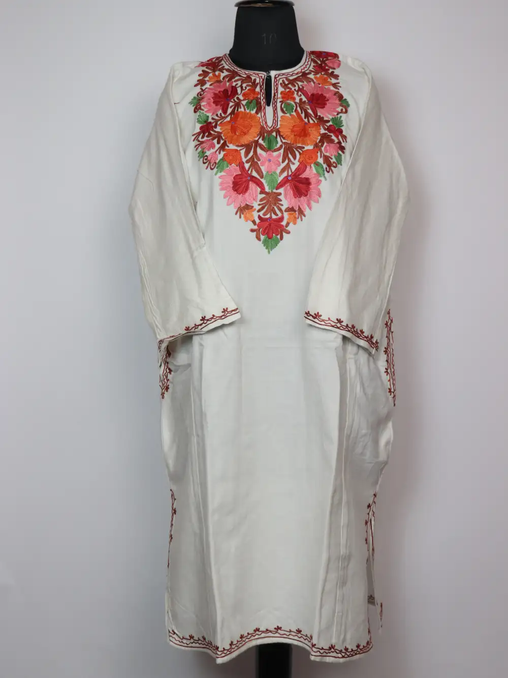 The neckline of this white feran shows graceful floral aari embroidery details, and the cashmilon fabric makes it perfect for daily wear.