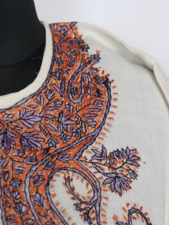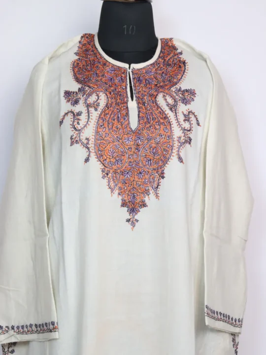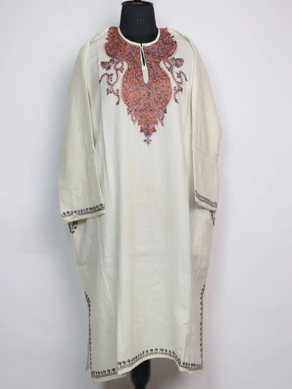 A white Kashmiri traditional pheran dress woven in Raffal Wool shows hand sozni kaam at the neckline in huge badam patterns and it includes pockets both sides for practical use.