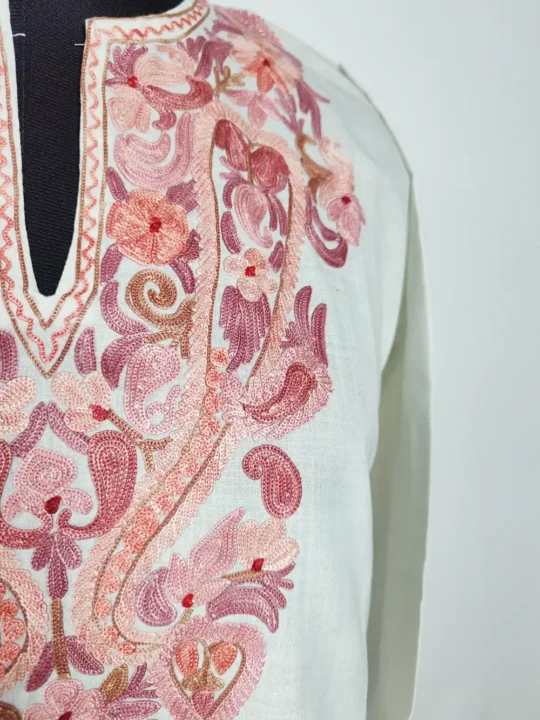 This short cotton kurti in ruby cotton is a perfect addition to your wardrobe for everyday wear. The neckline has floral and badam aari embroidery that adds a elegant traditional feel. It goes nicely with denim jeans and is a good choice under best kurti collection and cotton kurtis for women.