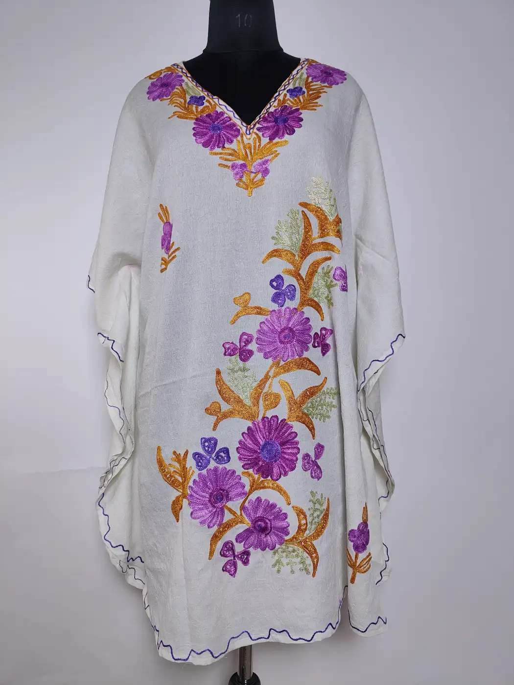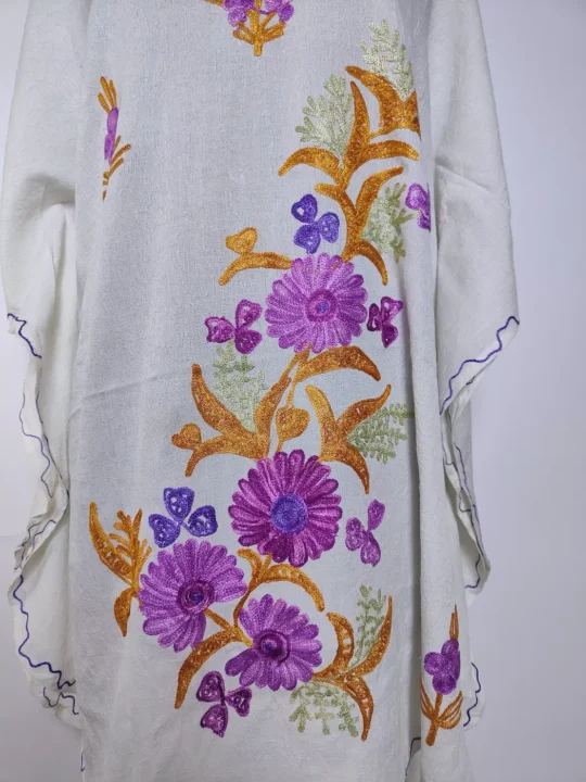 This Kashmiri aari kaftan features continuous floral embroidery across the neckline and a bold motif at the front panel. Crafted in white crush cotton, it carries a soft, airy feel with graceful embroidery.
