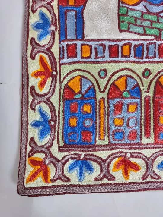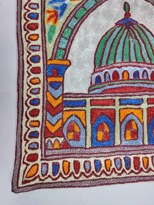 This set of 2 Islamic wall hangings give your home a peaceful and spiritually uplifting presence.The design of holy Masjid of Madina has been embroidered using hand chain stitch on rich white dusoot cotton. The intricate detailing highlights its domes and structure with care and respect.