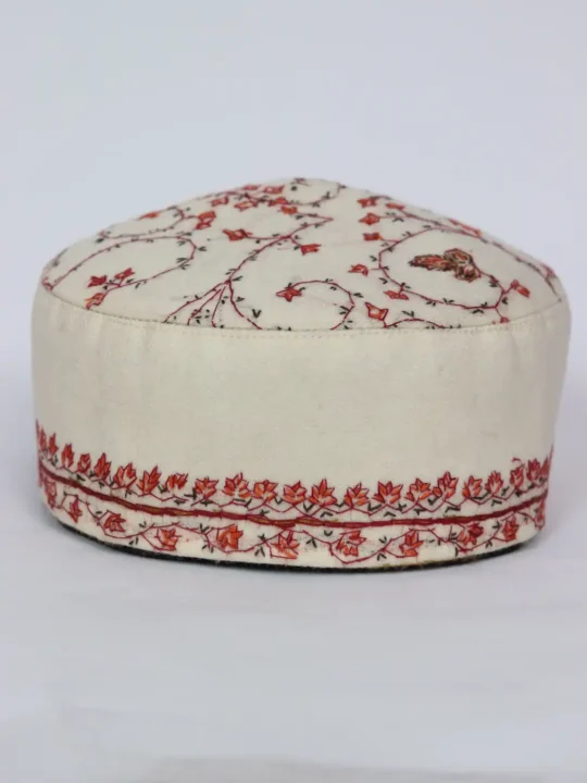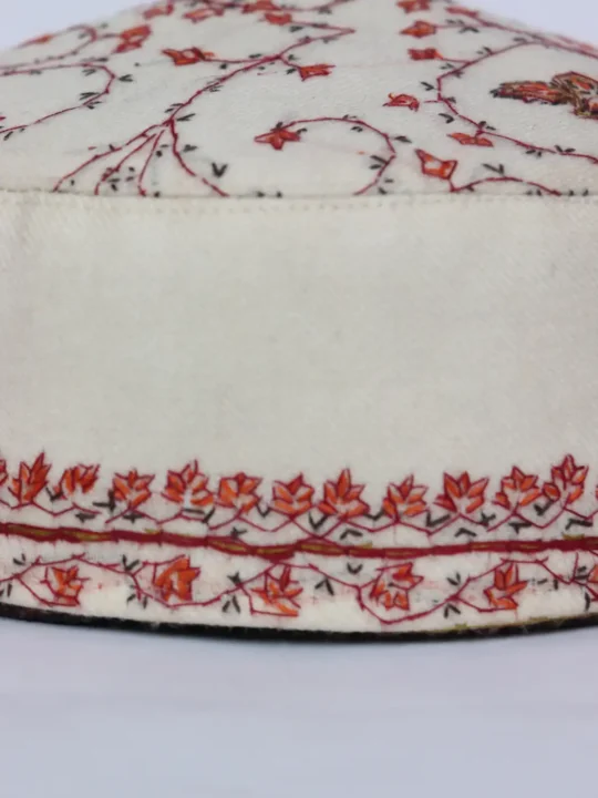 With its floral-inspired Sozni embroidery and soft Toosha fabric, this mens cap feels like a garden preserved in wool. Every thread speaks of Kashmiri heritage, hand-stitched by artisans in Srinagar. The embroidery showcases circular floral bound with four same floral motifs and parallel embroidery around the border. It’s gentle to wear and carries just enough detail to make a quiet statement—elegance that doesn’t try too hard, but never goes unnoticed