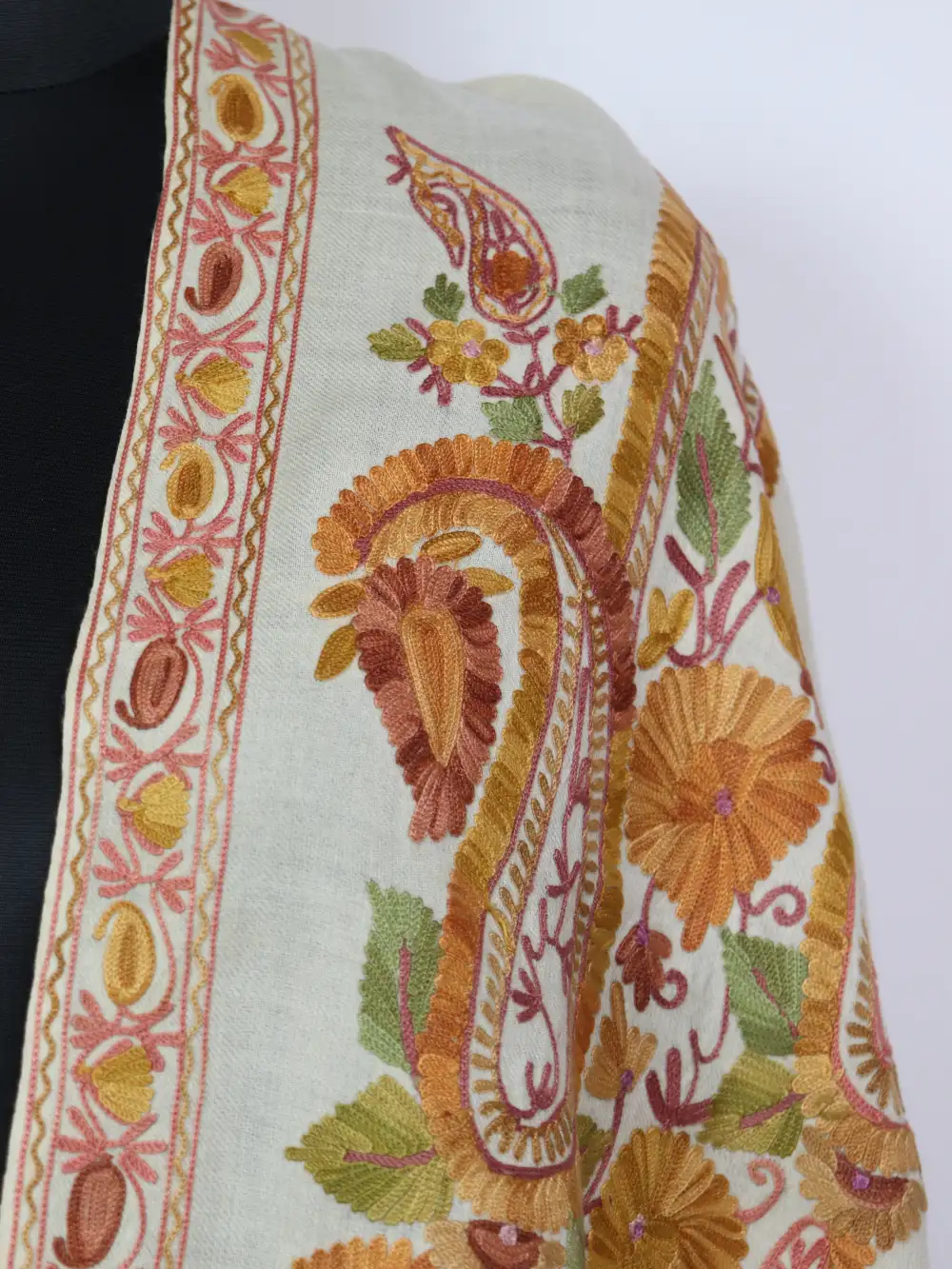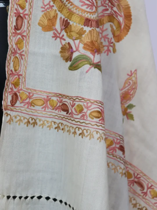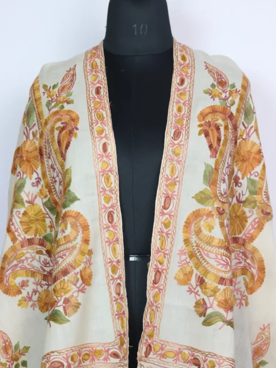 Crafted in pure wool, this white colour carries a composed fir and delicate decoration. It features huge floral designs all over it within border in aari embroidery.
