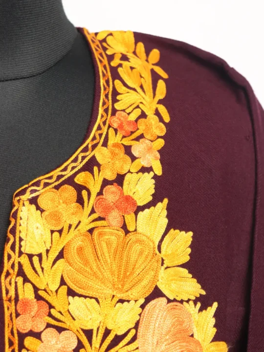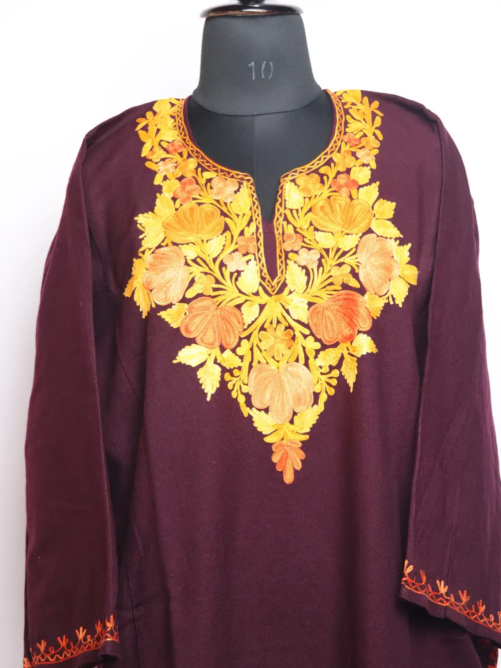 Made from cashmilon wool, ths wine hue Jashn-e-Rekhta kashmiri pheran features floral Aari embroidery which frames the neckline.