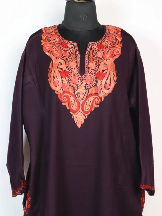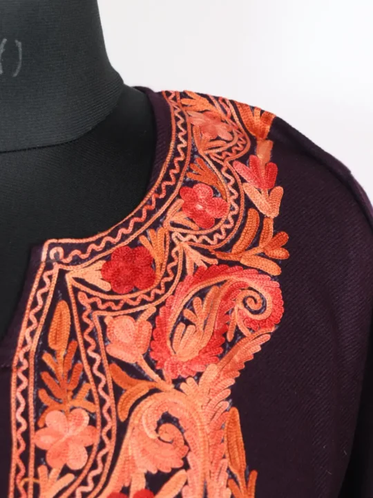 This graceful wine-colored cashmilon wool pheran showcases stunning Aari embroidery in a badam shaped, beautifully detailed in vibrant shades of orange and red. This pheran comes with two practical side pockets, making it ideal for everyday winter wear.