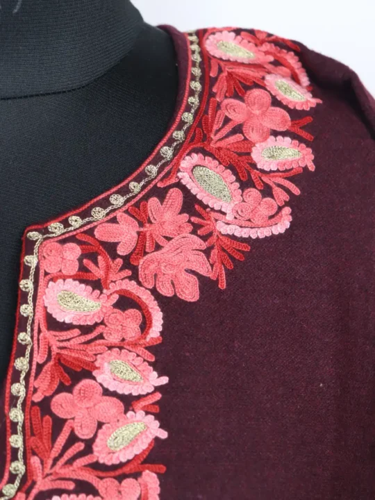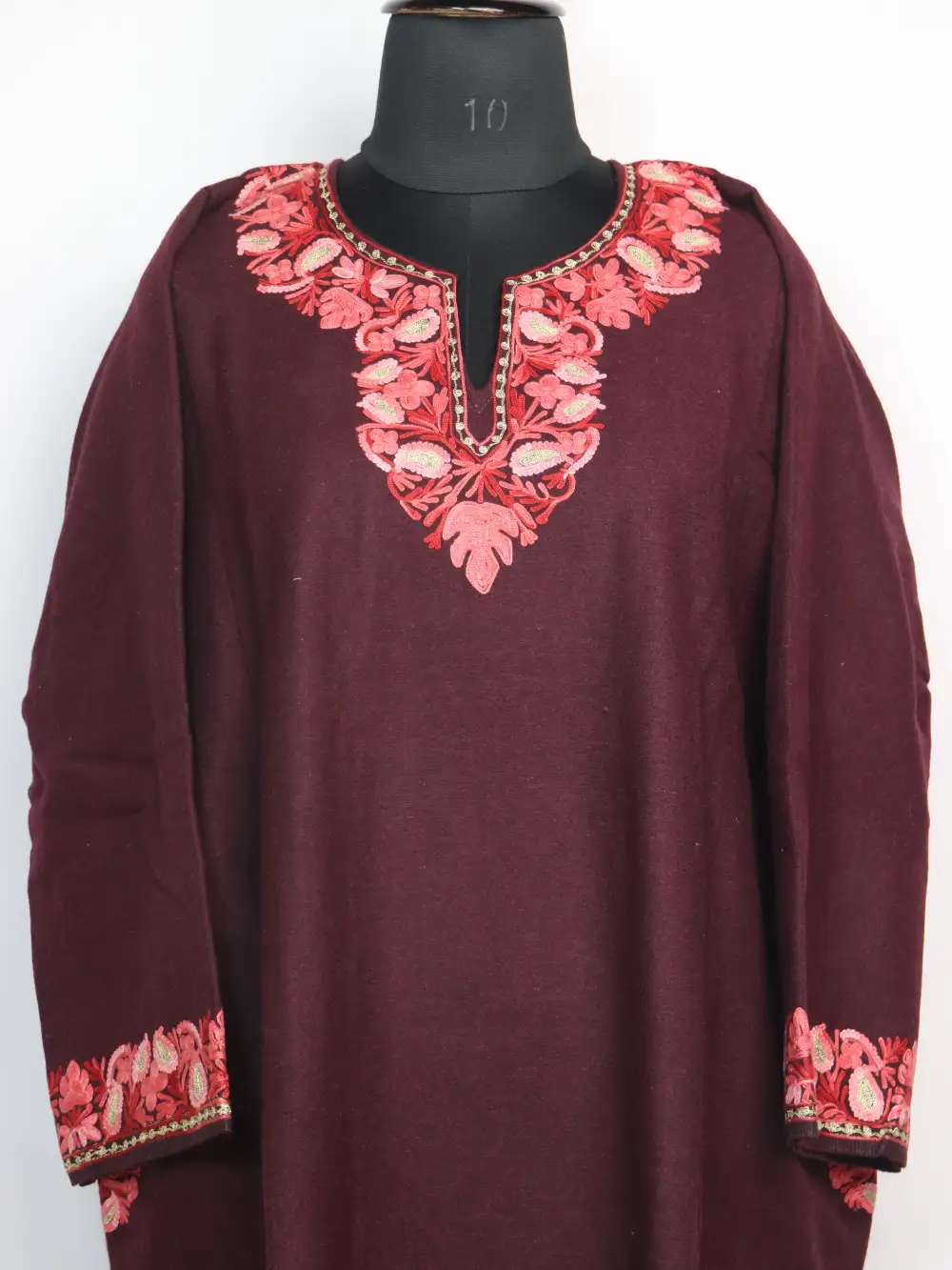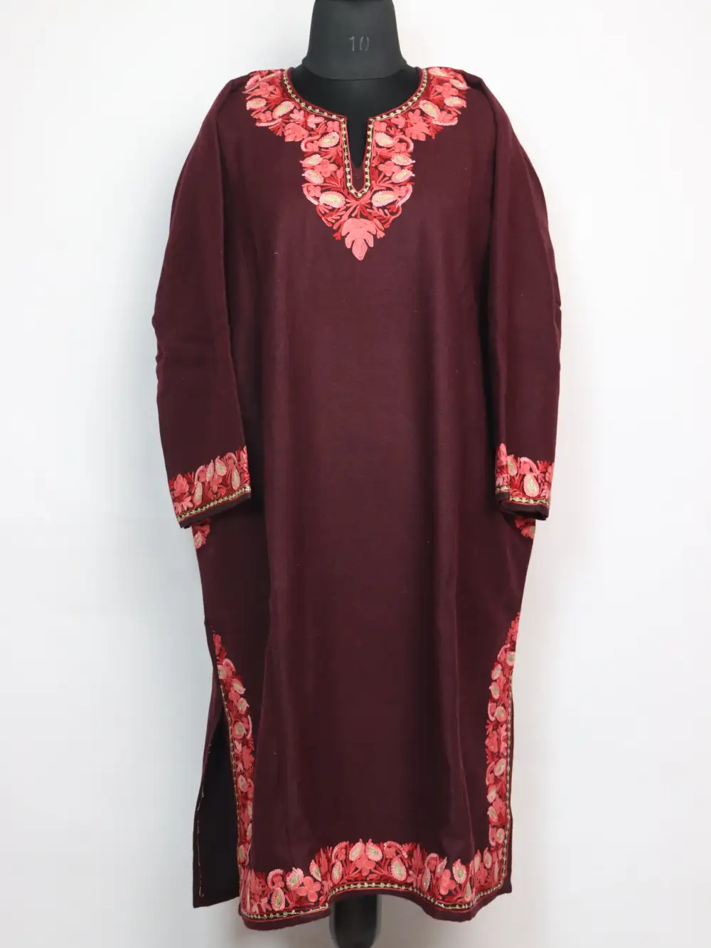 A wine colour pheran in tweed wool wears Aari and Zari at the neckline in continuous badam and chinar motifs, while pockets on both the sides add everyday function.