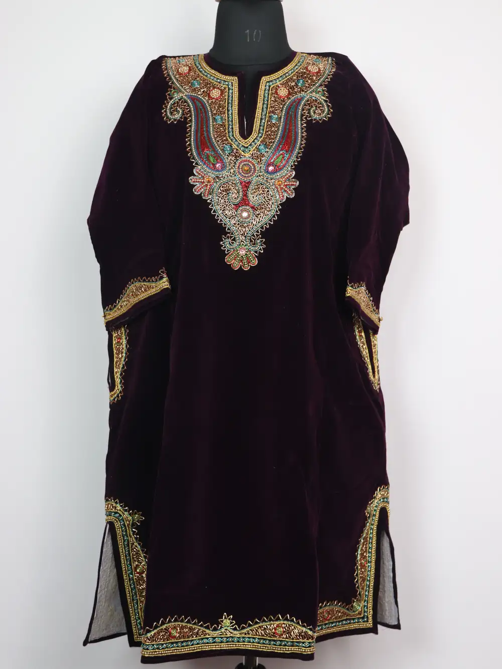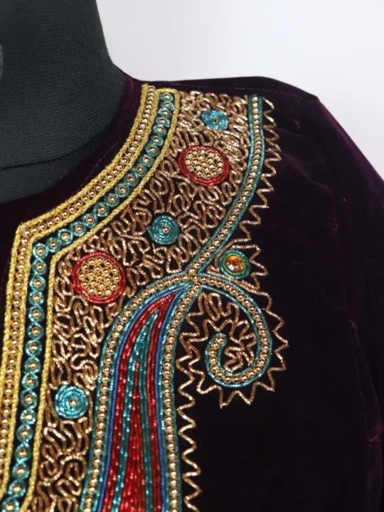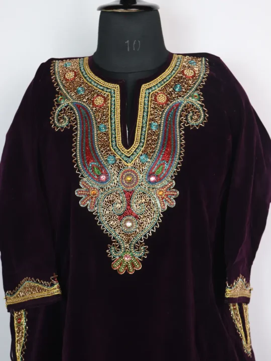 Crafted in velvet this wine hue phiran dress blends soft texture with useful design. It includes pockets both side so it suits daily life. Aari embroidery along the neckline is stitched into badam patterns that lifts the front and reads classically Kashmiri.