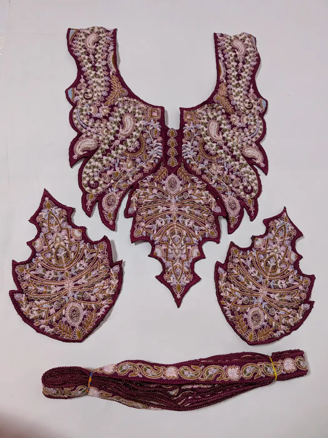 A wine base sets the tone for this patch set, where tilla embroidery brings floral and badam detailing to this cinar shaped neck patch and sleeve patches. The lace carries continuous patterns, completing the set with a balanced traditional look.