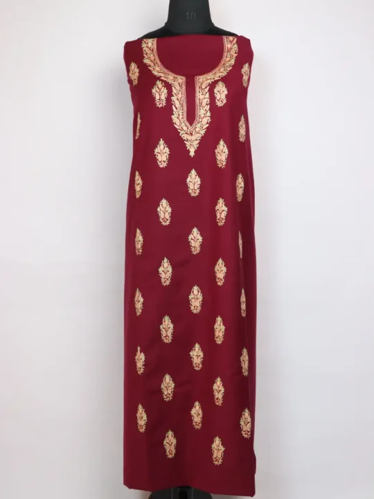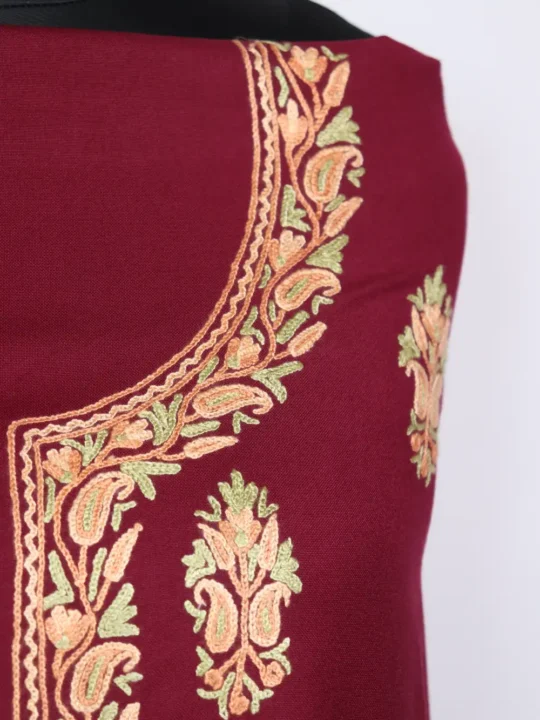 A warm Kashmiri 2pc designer woolen Suit in wine spun, comes unstitched to let you choose the cut. Its neckline floral Aari work lends subtle handcrafted charm while the body is adorned with booti style work for effortless pairing — this 2pc Suit is both practical and quietly refined.