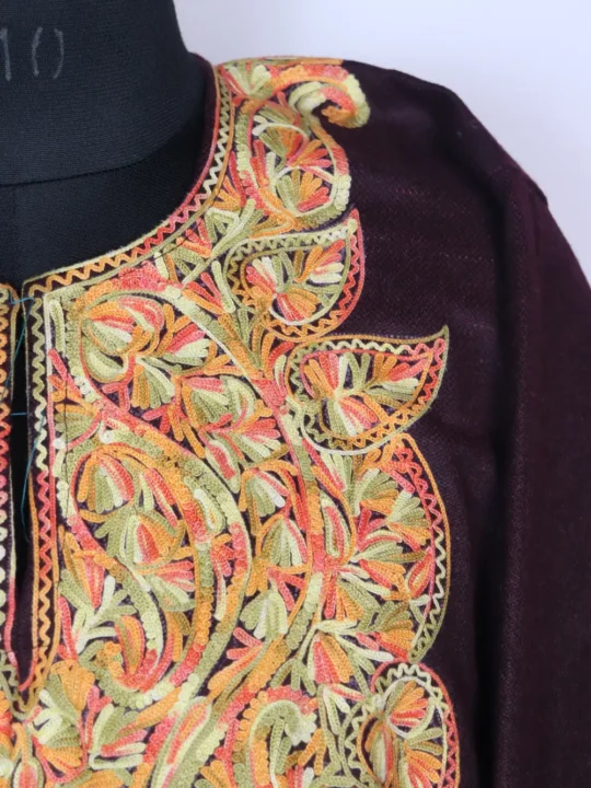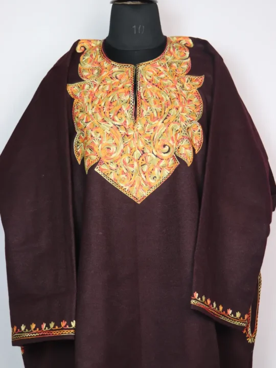 This tweed pheran comes with badam, posh bagh aari embroidery around the neckline, giving it a warm and classic Kashmiri feel.