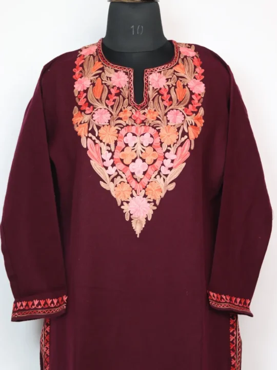 Made in wine colour Cashmilon Wool, this Kashmiri kurti features floral Aari at the neckline and it just comes under 1250 rs. This Kurti keeps the body calm so the neckline work becomes the decorative focus.