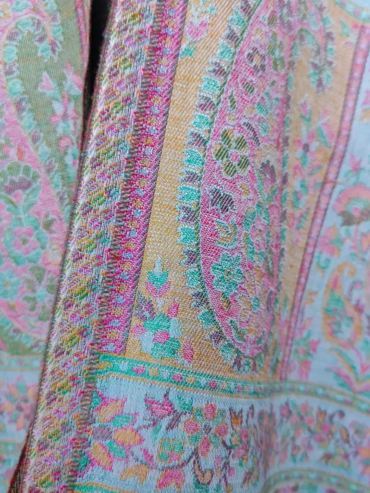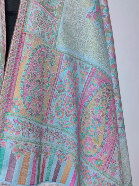 Soft modal silk shapes this greyish blue Kashmiri kani stole, where floral and badam motifs spread across the surface in a balanced pattern. The striped border adds contrast, making the overall design feel complete. It’s a subtle yet expressive piece with timeless Kashmiri character.