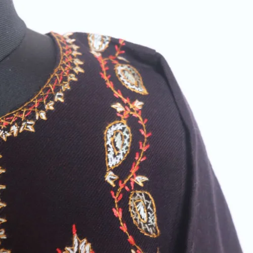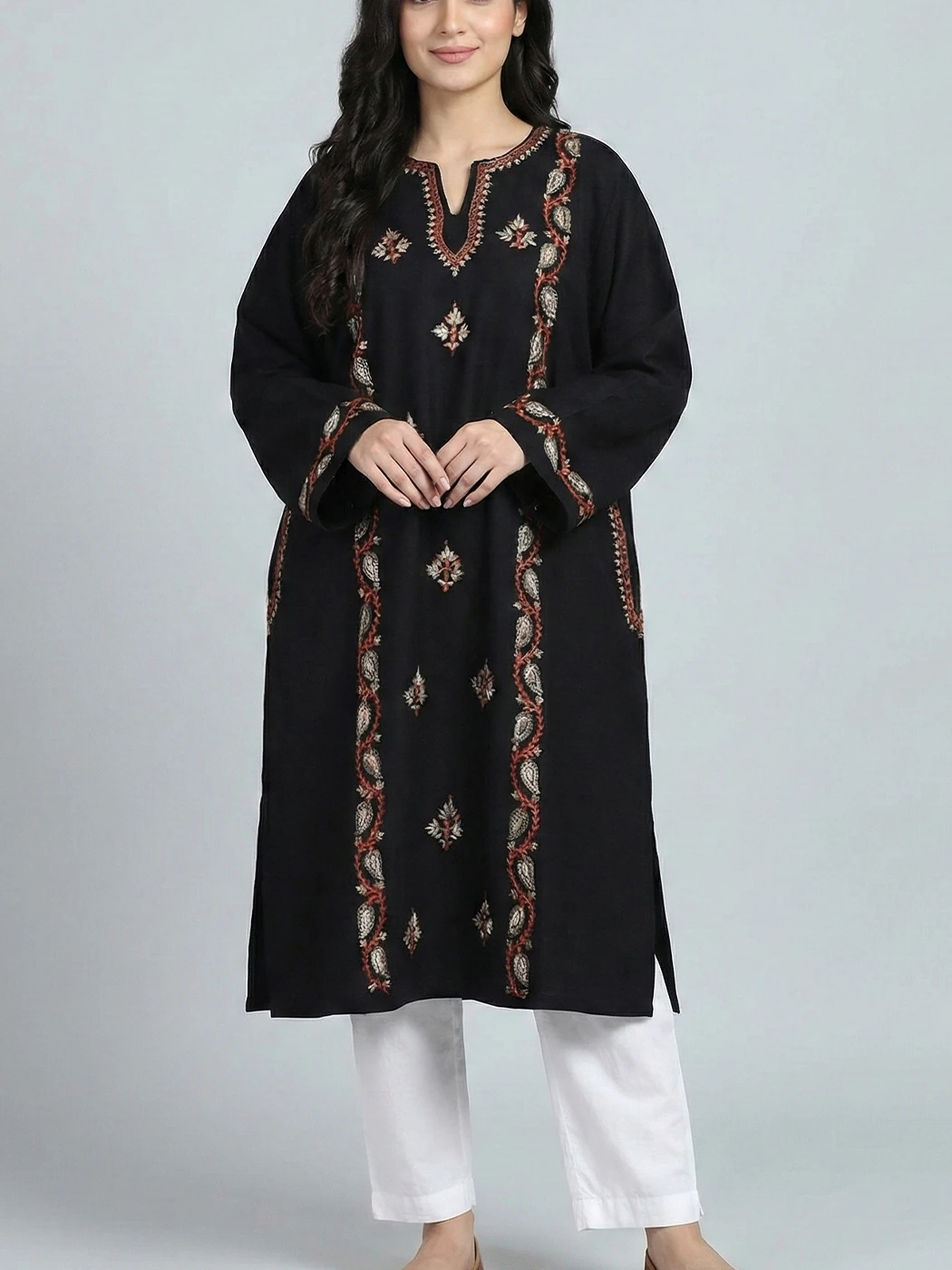 This Kashmiri black pheran is crafted from high-quality Cashmilon fabric to offer comfort and style during winter. Its elegant embroidery represents the rich cultural heritage of Kashmir. It is a perfect addition to your wardrobe.