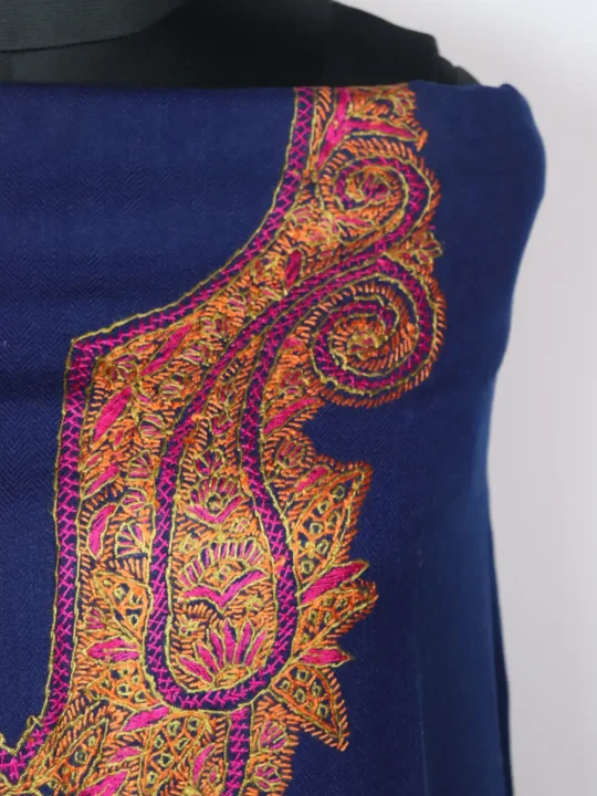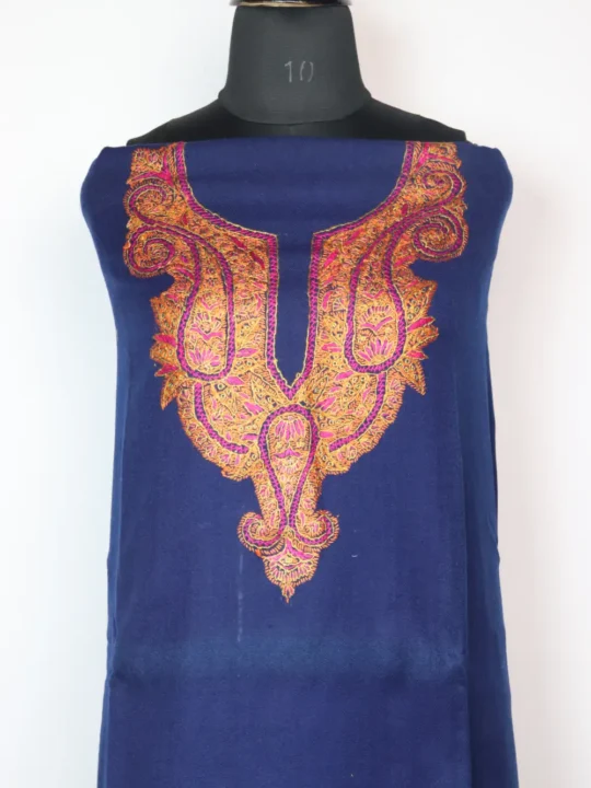 Crafted from warm pure wool, this 3pc suit showcases finely done hand sozni paper machie badam embroidery around the neckline. It arrives unstitched with kameez, salwar, and dupatta for stitching according to your measurements.