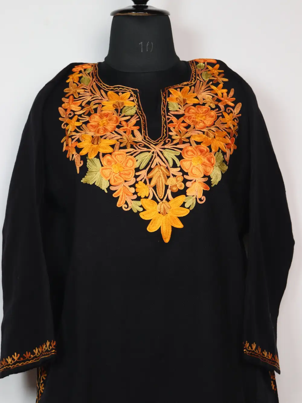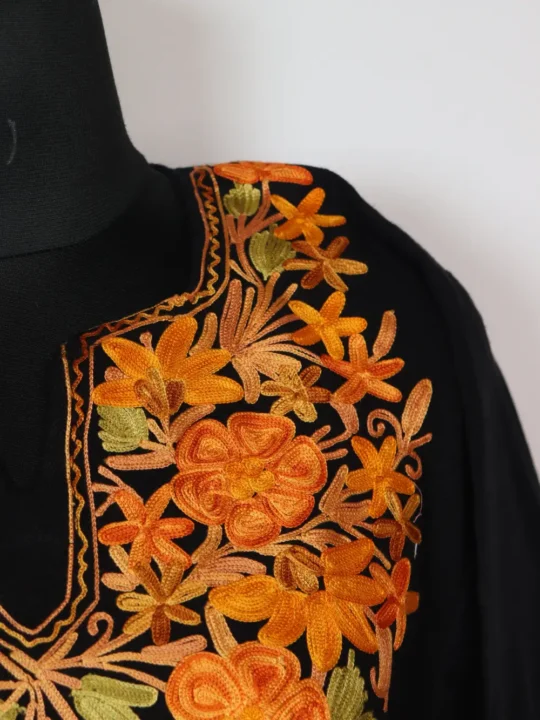 A black colour Pheran Set crafted in Cashmilon Wool carries Aari embroidery at the neckline in floral patterns. It includes pheran and trouse so you get a full coordinated set.